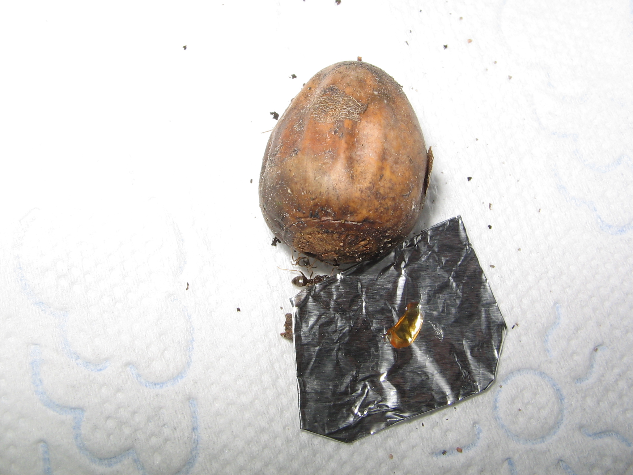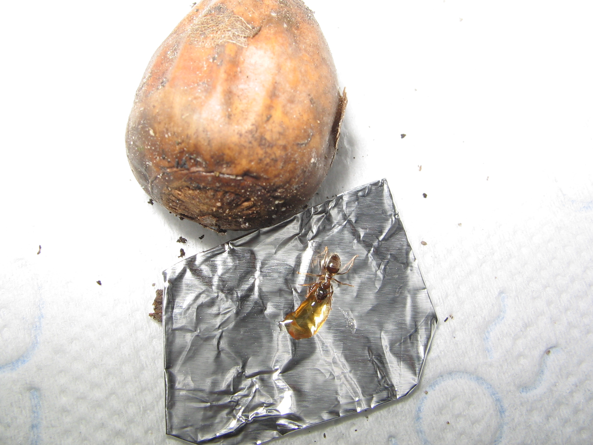 Eine Eichel mit Loch habe ich mitgenommen, da in der nĂ€he eine sehr kleine Ameise herumgelaufen ist. Ich ging also davon aus, dass in der Eichel eine Temnothorax Kolonie wohnt und habe diese mitgenommen. Zuhause angekommen kamen aber plötzlich ganz andere Ameisen als erwartet aus der Eichel, also werde ich diese morgen zurĂŒckbringen.