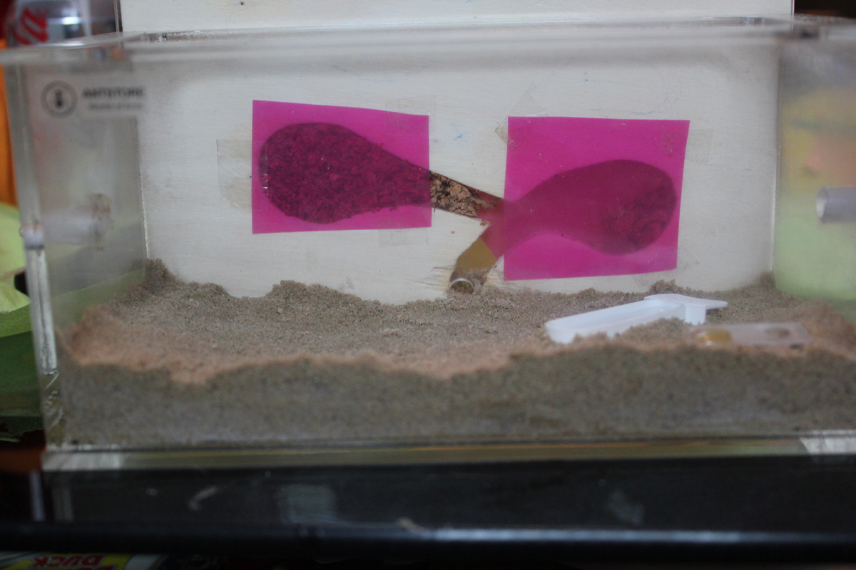Ich kann leider noch immer nicht behaupten, dass entweder was gegessen oder aufregendes getan wird. Einzig und allein, und da bin ich sehr enttäuscht da ich extra dem Händler sagte ich brauch ein Nest was mindestens ein Jahr hält, eine Ameise grabt sich durch den Kork. Und das in echt zügigen Tempo an beiden Enden. Ich hoff die kommt ned durch weil rundum is der Kork offen