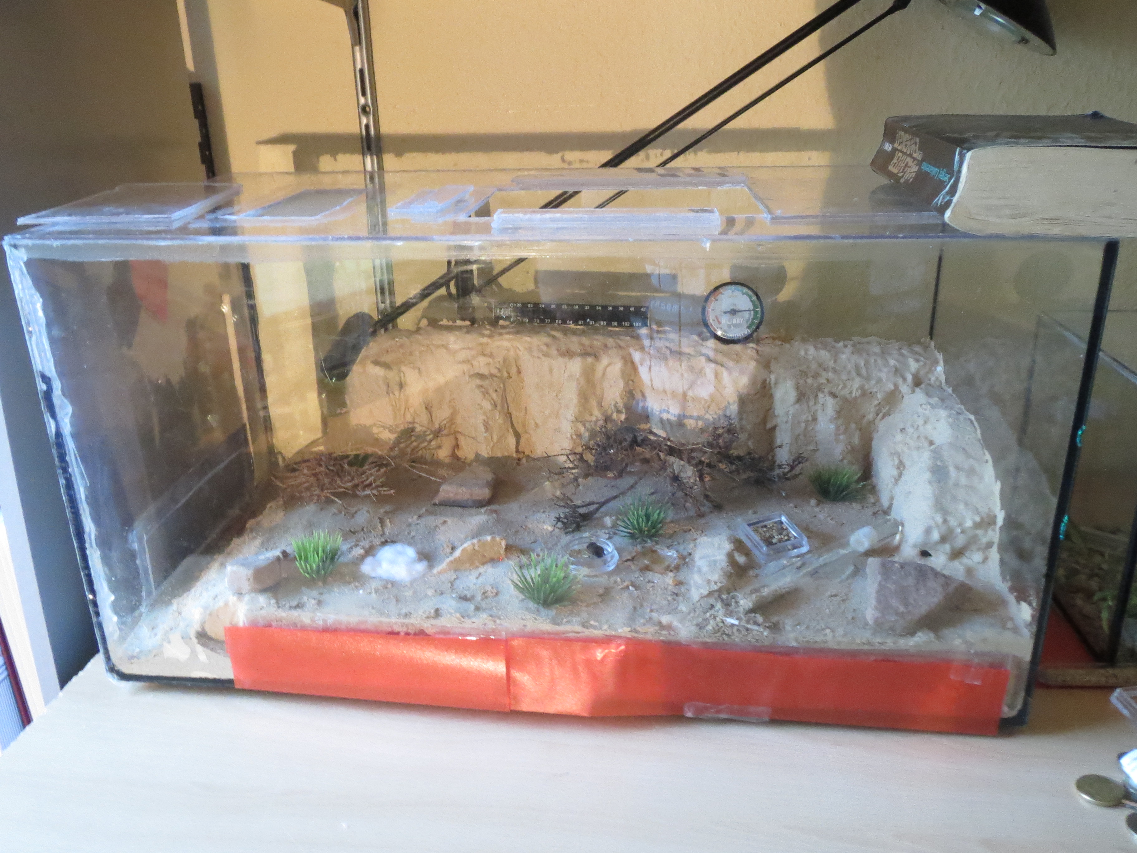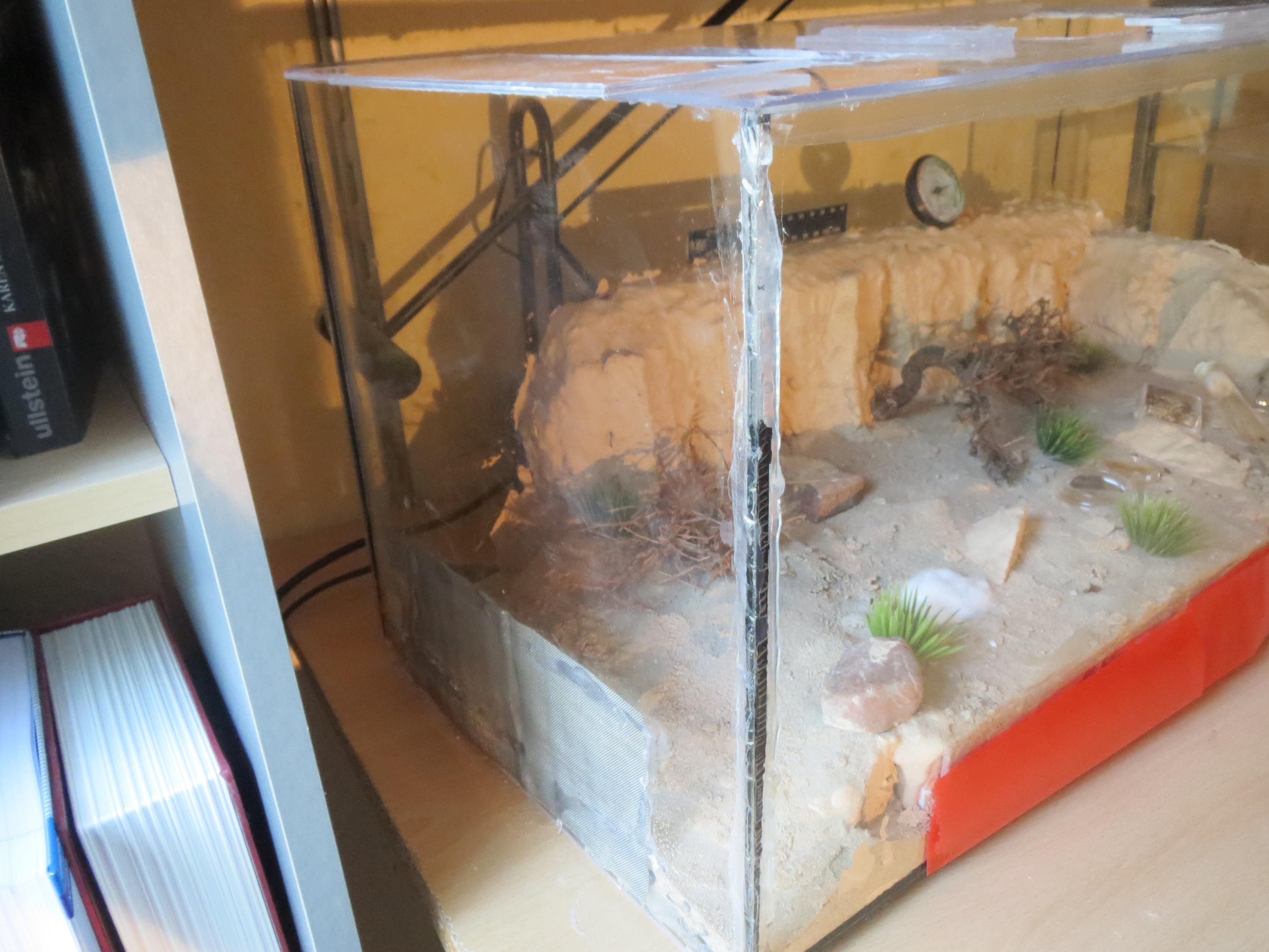 Das eigentliche Problem: Ich habe das Becken gestern nur grob überprüft. Es ist ein 60*30*30 Becken aus Glas. Eine Wand wurde wohl für die Belüftung durch Plexiglas ersetzt und es besitzt einen Plexiglasdeckel. Heute morgen dann das unschöne Erwachen: Der Deckel ist kaum dicht, die Wand weist mehrere Lücken auf... Nun habe ich also vorerst mal die Wand mit Klebeband abgedichtet (um das ganze noch schöner zu machen...) und den Deckel ersteinmal beschwert.