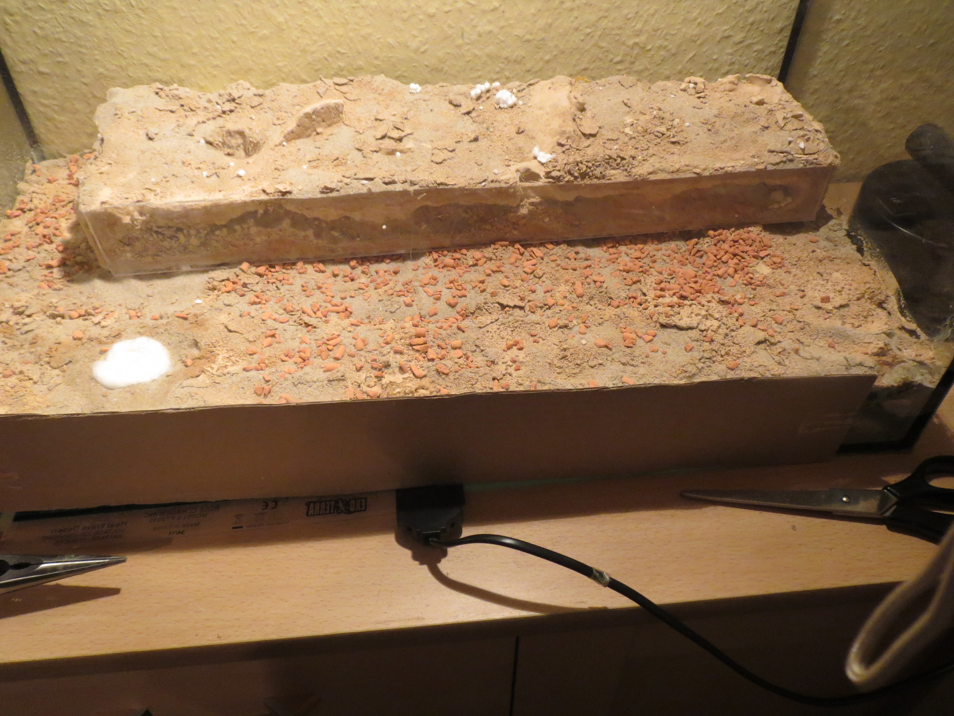 Das Volk befindet sich in dem Ytongblock im Boden. Ich habe keine Ahnung wie groß dieser Block insgesamt ist und ich kann ihn auch nicht einsehen um die Volkgröße abzuschätzen, da er wohl schlecht abgedunkelt war und die Ameisen einfach die Scheiben zugebaut haben. Laut seiner Aussage sind es etwa 40 Arbeiterinnen + 2