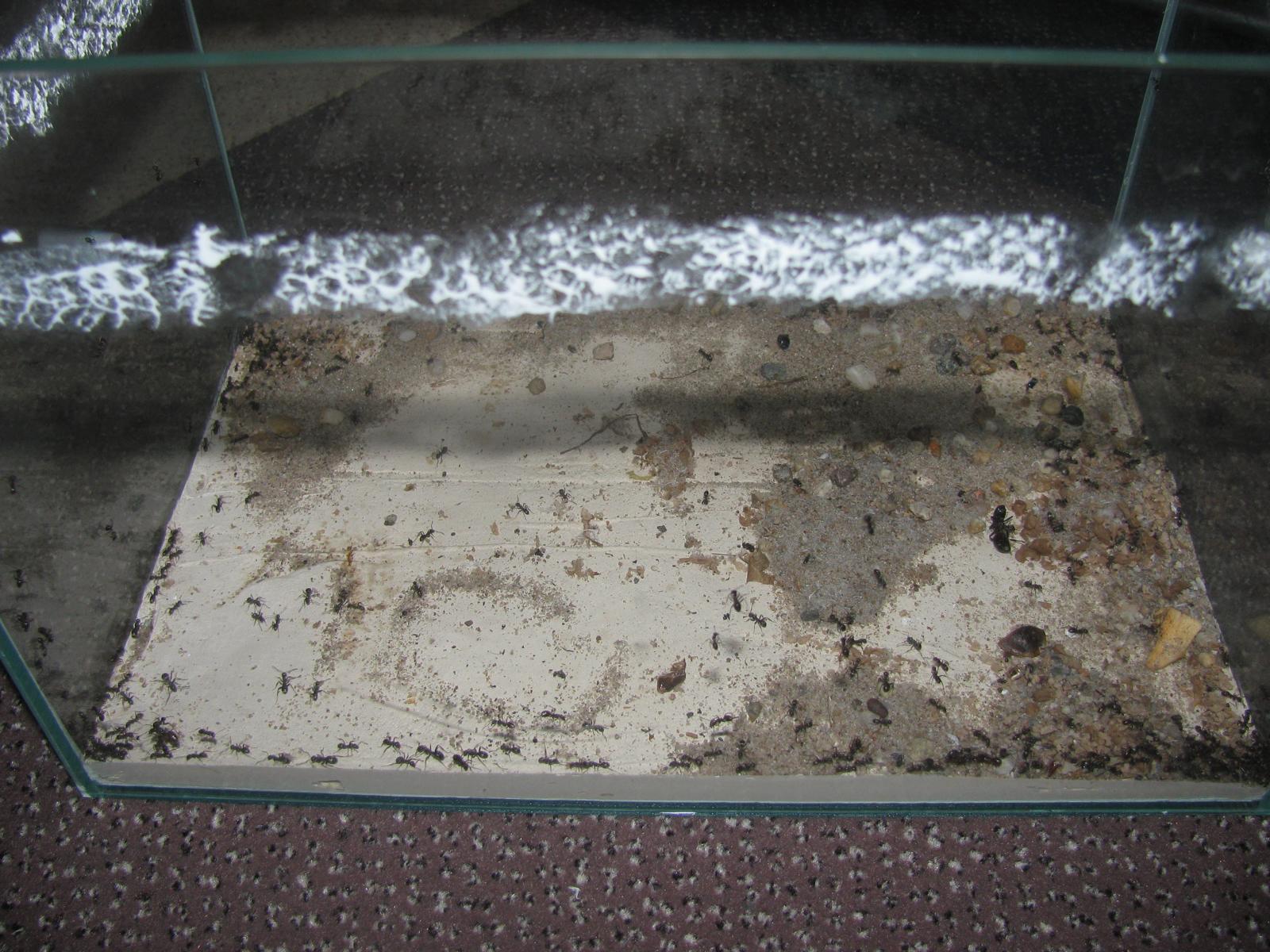 Es hat mir nicht mehr gefallen, ich hatte bereits ein paar Objekte entnommen die in 3 andere Becken besser gepasst hatten. Außerdem hatten die Ameisen immer mehr Sand und Müll aus dem Nest getragen - wen wundert es.