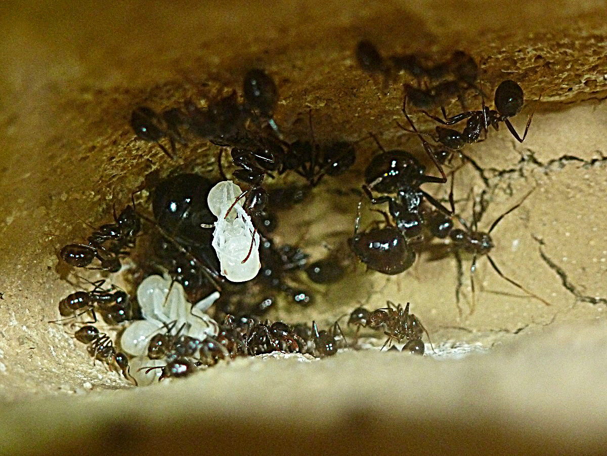 Nachdem alles ein wenig getrocknet war, habe ich die Kolonie auch direkt hineingesetzt, innerhalb weniger Sekunden hatten sie das liegende Nest entdeckt und begannen ihre Brut aus