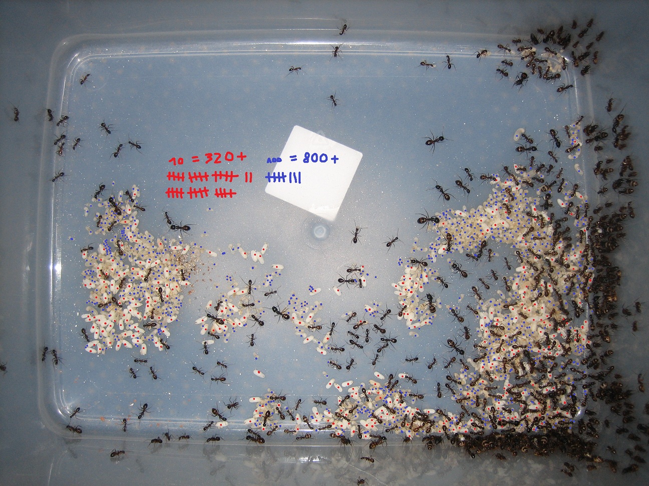 ich zĂ€hle meine Kolonien auf den Fotos. DafĂŒr mache ich entweder ein Foto von dem gesamten Nest oder mehrere Fotos von Teilabschnitten des Nestes. Am Computer kann ich dann in aller Ruhe die Arbeiterinnen und die Brut zĂ€hlen.