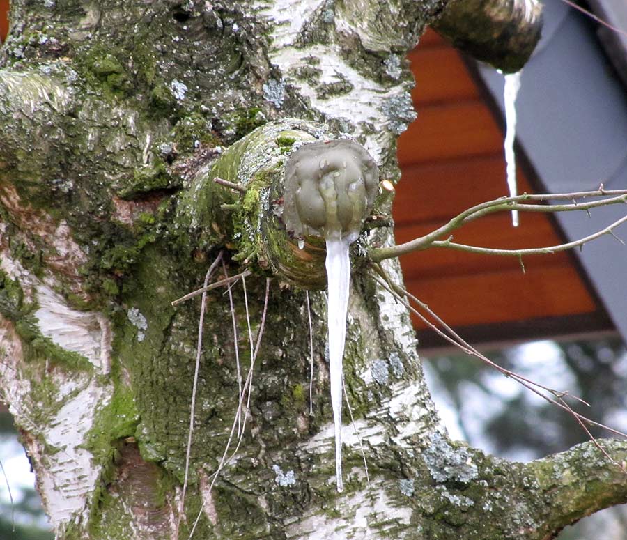 [font=Times New Roman]Bei LaubbĂ€umen ist das Anschneiden effektiver: Birken „bluten“ so, dass man den Saft flaschenweise abfĂŒllen kann (z. B. fĂŒr Haarwasser) (in Bild 3 ist nach unsachgemĂ€ĂŸem RĂŒckschnitt der Saft bei Frost zu Eiszapfen gefroren; die graue "KĂŒnstliche Rinde" wird durch den Druck des Birkensaftes aufgewölbt). An Eichen sieht man außer Ameisen auch viele andere Insekten an dem Saft trinken, bis hin zum HirschkĂ€fer.[/font]