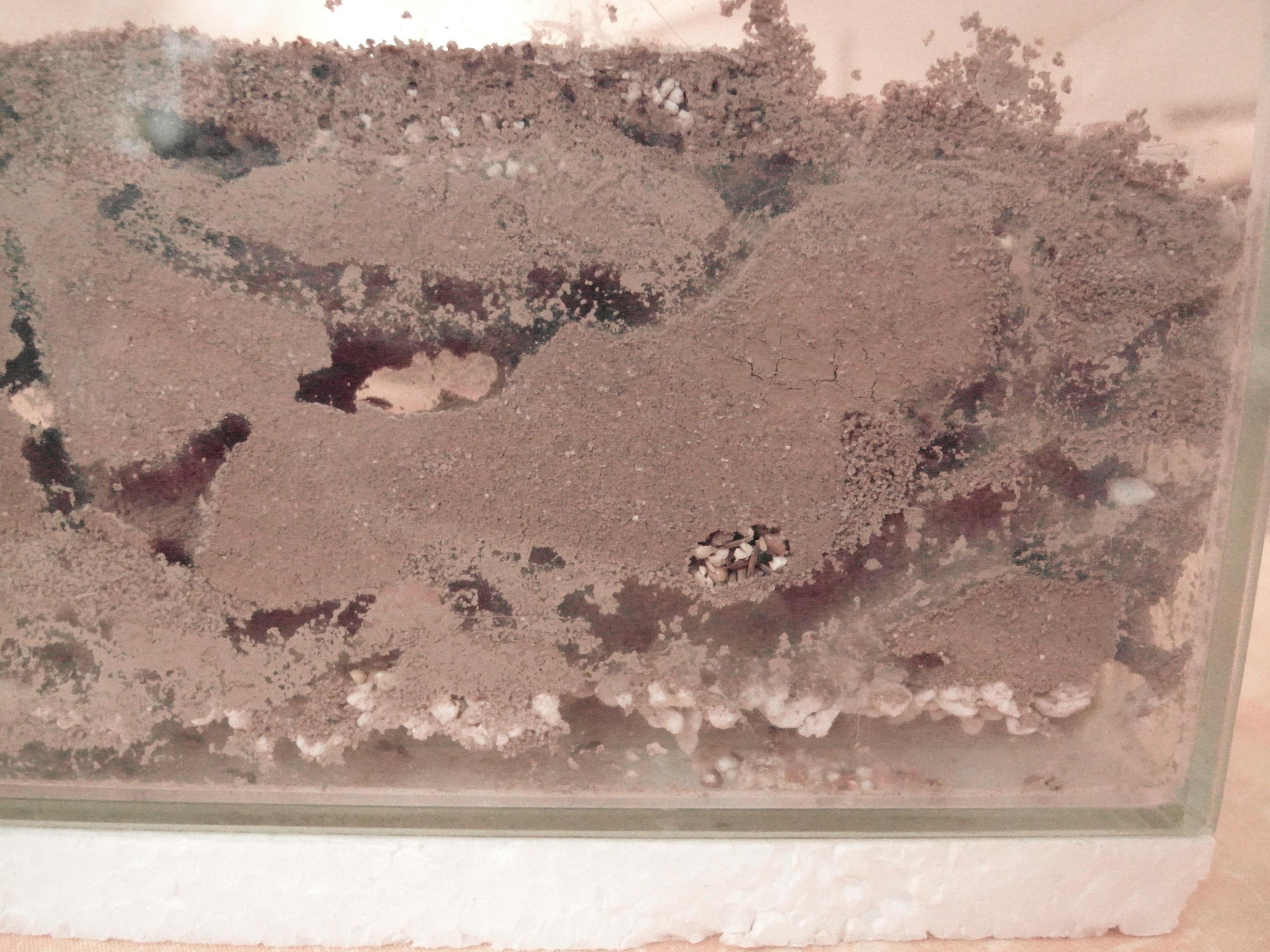 Sie gruben und gruben. Den Aushub musste ich regelmäßig entfernen. Ich befeuchtete dann nur noch durch das Röhrchen sodaß der Rest des Nestes trocken wurde. Man konnte dann schön erkennen, wie System in die Sache kam.