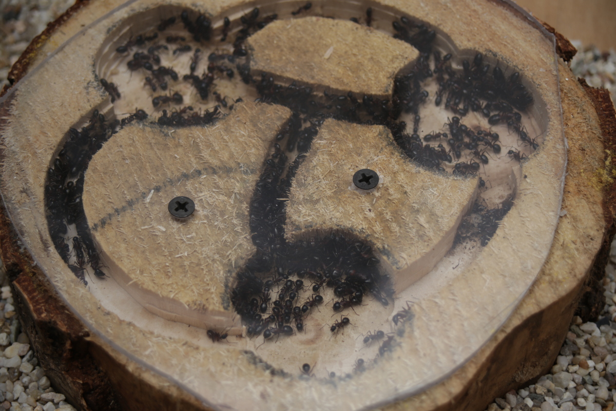 Mittlerweile stecken die Ameisen in meiner neuen Wohnung im 35er Cube und natĂŒrlich mitten in der Brutaufzucht. Es gab sehr wenige AusfĂ€lle ĂŒber den Winter, vielleicht 2 oder 3 und die Brut ist auch super durchgekommen. Einige Larven haben sich sogar schon verpuppt und Proteine werden immer gern und viel angenommen. Sogar subadulte WĂŒstenheuschrecken werden sorgsam zerlegt und in das neue Holznest gebracht. Das alte Nest war von den Dimensionen leider etwas zu groß fĂŒr den Cube, daher habe ich ein Holznest gebastelt, in das sie auch schnell umgezogen sind.