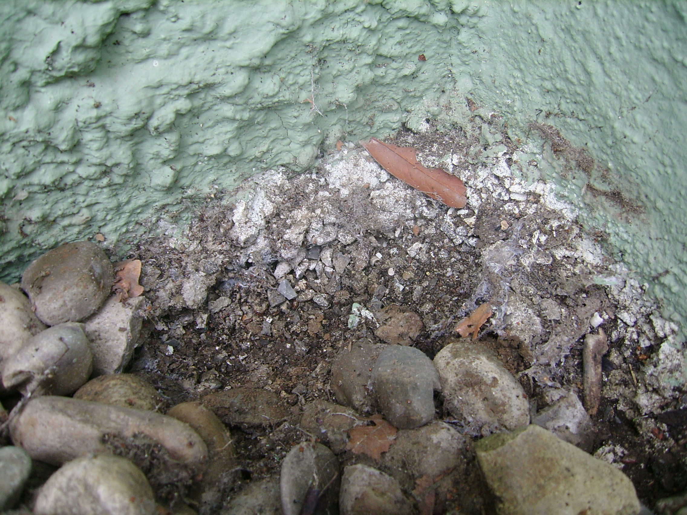 An einer Hausecke habe ich bei meiner heutigen Suche viel krümeligen Auswurf gefunden (s. Bild).