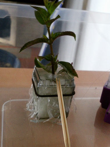 Das Haargummi hält die Folie dichter am Behälter als Klebeband oder Adhäsion und Kohäsion. Zur Erleichterung gibt es noch eine Brücke aus Zahnstochern.