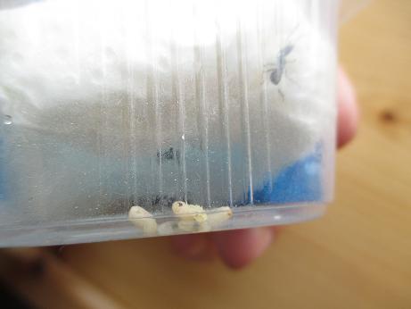 Heute gab es wieder eine kleine Fütterung! Ein kleiner Weberknecht diente als Proteinlieferant, der eigentlich sehr zügig und ohne Zögerung in's Nest geschleppt wurde. Also eine ganz andere Beobachtung als wie Gestern bei der kleinen Mücke. Ich denke, die Larven sind besonders nach der Lieferung und der Zeit dazwischen, bis sie endlich ins Reagenzglas umzogen, doch sehr hungrig geworden. Jetzt wird es wohl öfter Insekten geben, ich bin wirklich froh das sich schon etwas bei dieser Kolonie tut, ich rechnete ja eigentlich mit einer claustralen Situation!