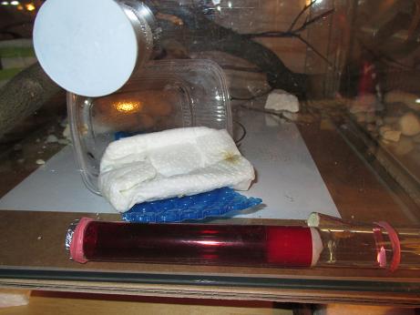 Die Kleinkolonie umfasst eine wunderschöne Gyne (black pearl ;)), fünf Pygmäen und ein dutzend Puppen, Larven und vereinzelt Eier. So viel Ameisenfleisch hab' ich wirklich nicht erwartet und bin deshalb sehr damit zufrieden! Leider wurden sie in einer kleinen Dose geliefert, dass heißt, sie müssen heute oder demnächst die Umsiedlung in das nun vorbereitete Reagenzglas (ganz klassisch: rote Folie, dicker Wassertank, mit Alufolie den Eingang verkleinert und am anderen Ende vom RG ein Stück Holz befestigt damit das ganze nicht ins rollen geriet) vollbringen. Momentan, wie man auf einem Foto erkennt, steht die geöffnete Dose in der Nähe vom RG, daweil verzogen sie sich unter der Küchenrolle, die kennen sie ja schon :tongue:.