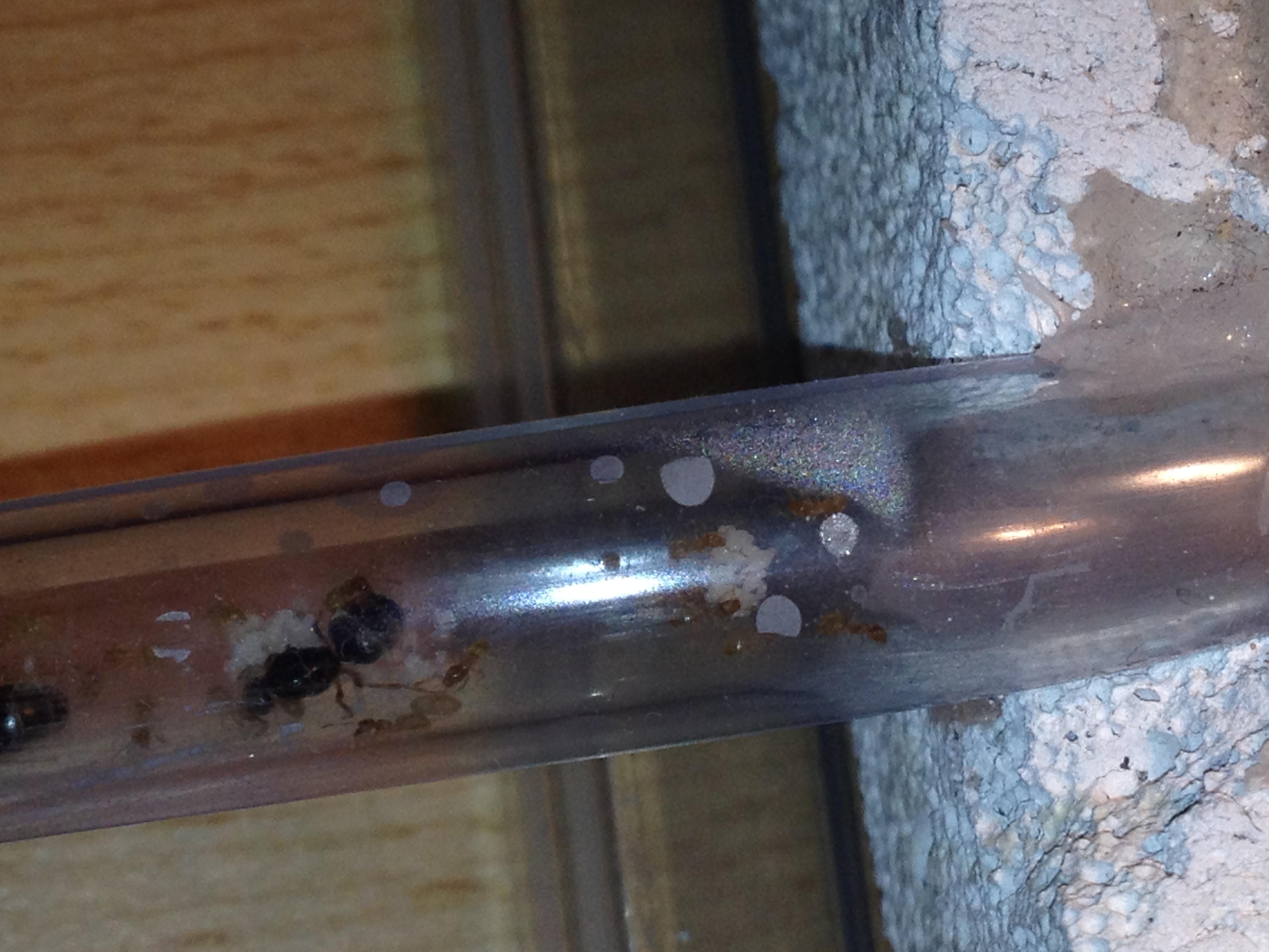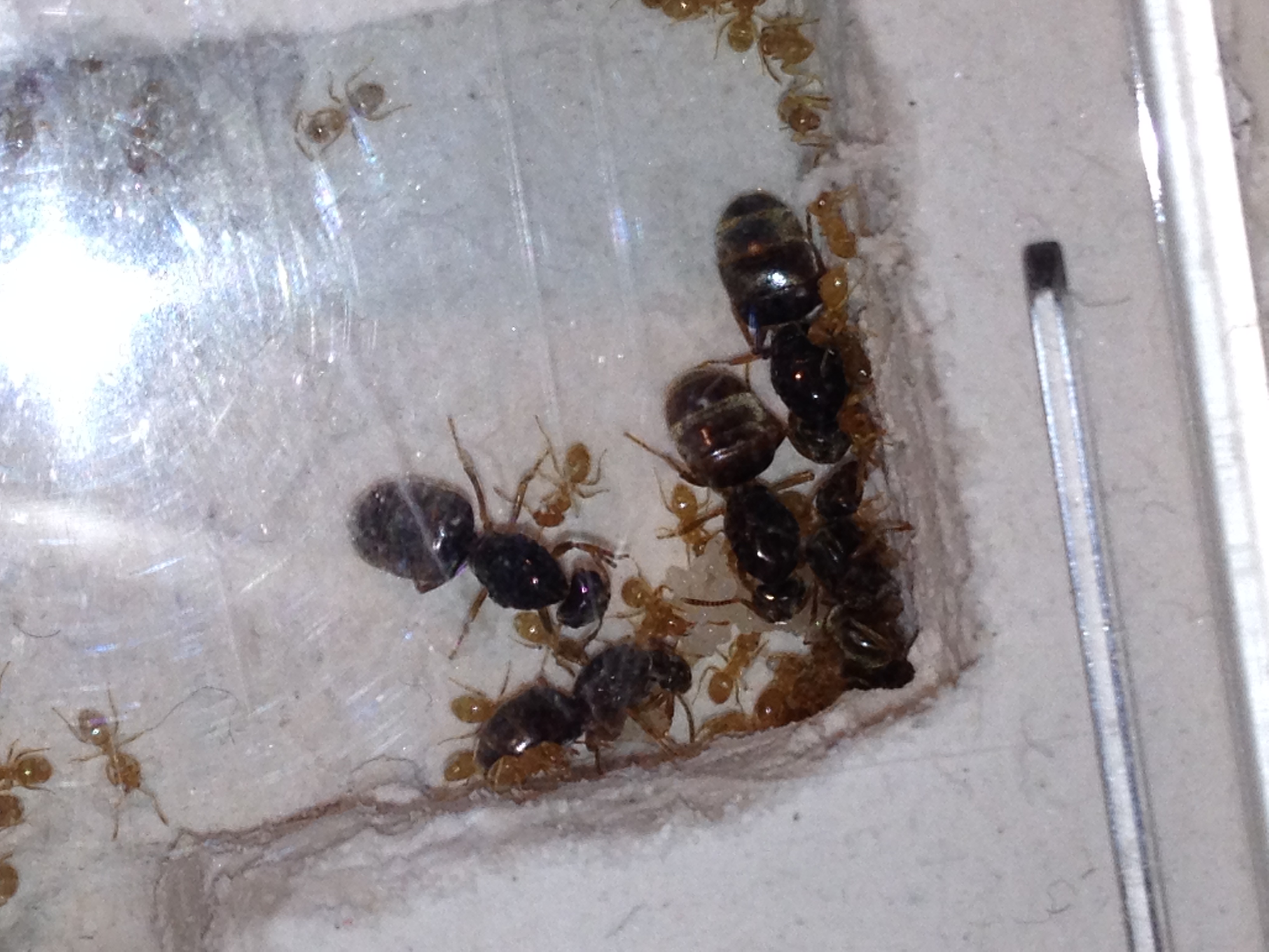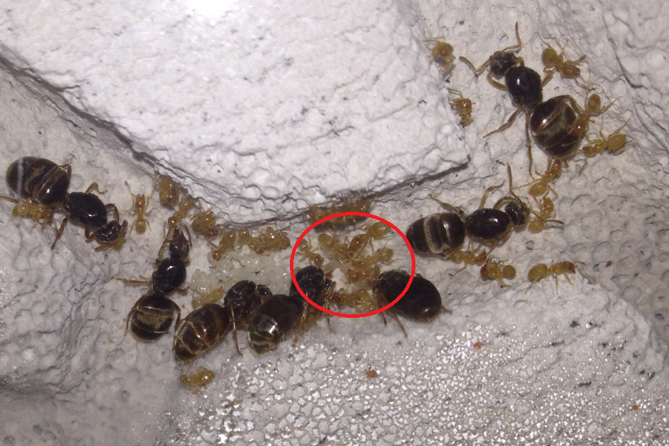 Habe grade ein Bild geschossen, (mit Iphone 4S , erstaunlich wie viel man sieht!!) , die Ameisen haben einen Teil der Eier einige cm verlegt. Ich meine sogar einige Larven erkennen zu können (roter Kreis).