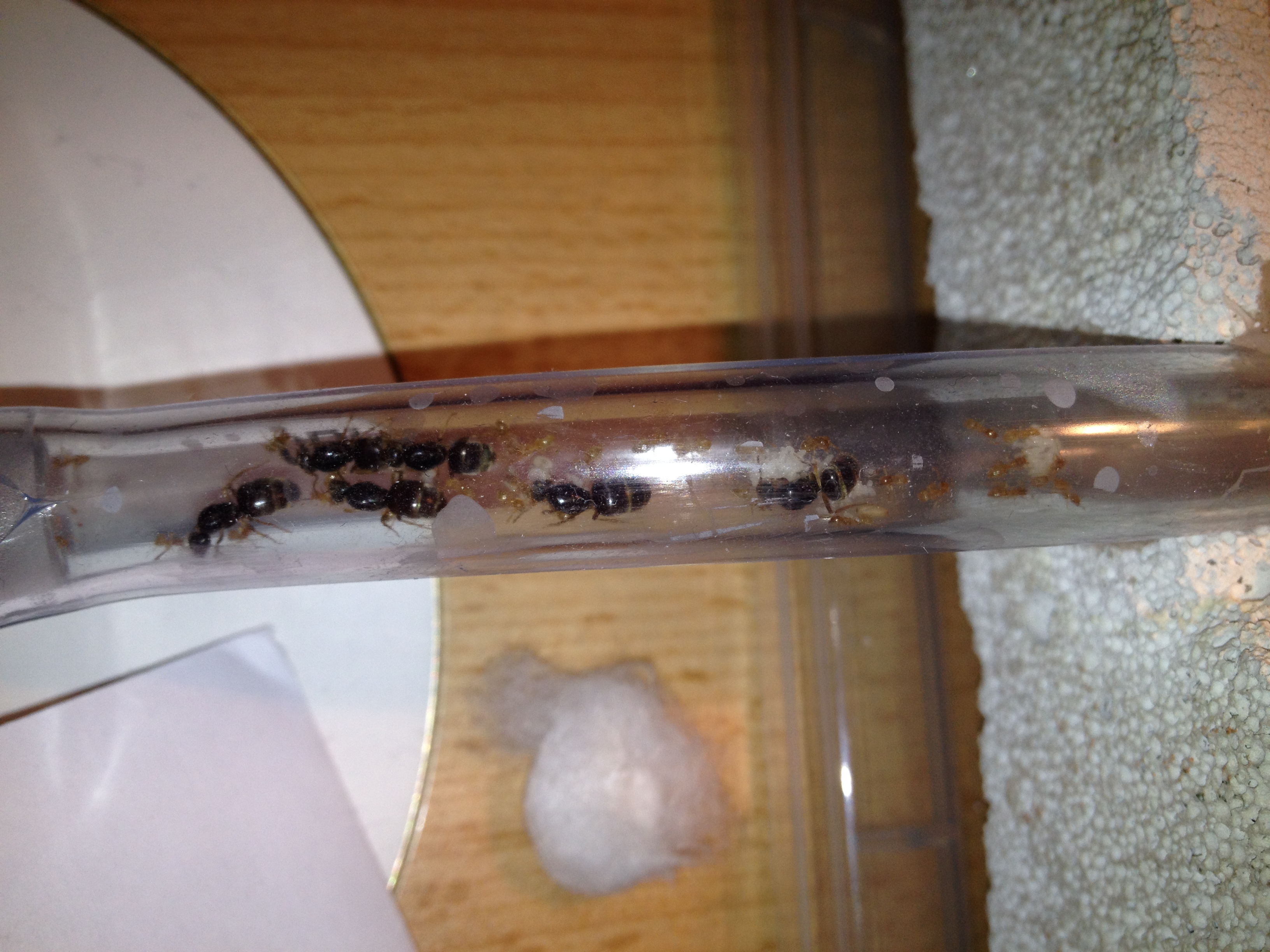 Nachdem sie das Nest verlassen hatten(Was den ganzen Tag dauerte ), habe ich den Schlauch entfernt und mit Watte verschlossen. Leider habe ich beim Entfernen des Schlauches eine Arbeiterin angequetscht.