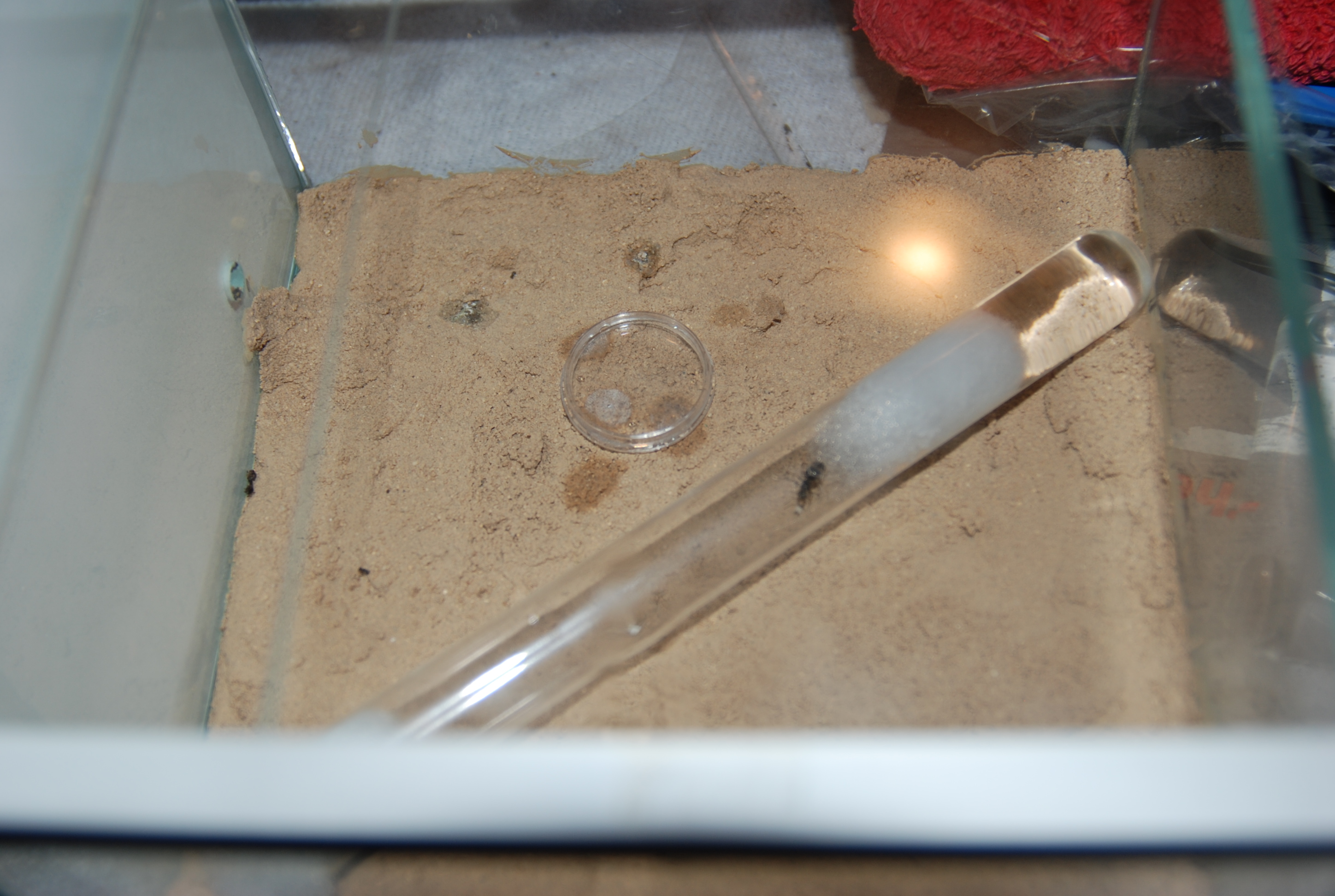 Nun zu der Sache mit den Lasius niger. Am Sinnvollsten wäre es, wenn du ihnen in der Arena ein Reagenzglas anbietest, versehen mit einem Wassertank und im besten Fall mit etwas Alufolie abgedunkelt. Da Ameisen versuchen unter den günstigsten Bedingungen zu nisten, werden sie unter Umständen umziehen. Wenn die Glasscheibe des Nestes nicht abgedeckt ist, sind die Tiere einer gewissen Menge an Licht ausgesetzt und unter Umständen würden sie das dunkle Reagenzglas bevorzugen.
