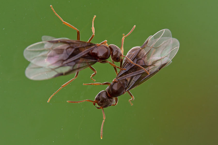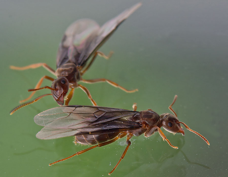 Seit Jahren dringen nur um diese Jahreszeit an einer dunklen Stelle im Flur Ameisen in unsere Wohnung ein. Die geflügelten Exemplare laufen oder fliegen durch die Wohnung um früher oder später am Fenster zu landen, von wo sie mehrmals am Tag in die Freiheit entlassen werden. Ein Trupp kleiner, gelblicher Ameisen hält sich in dieser Zeit Tag und Nacht nur an der Stelle im Flur auf.