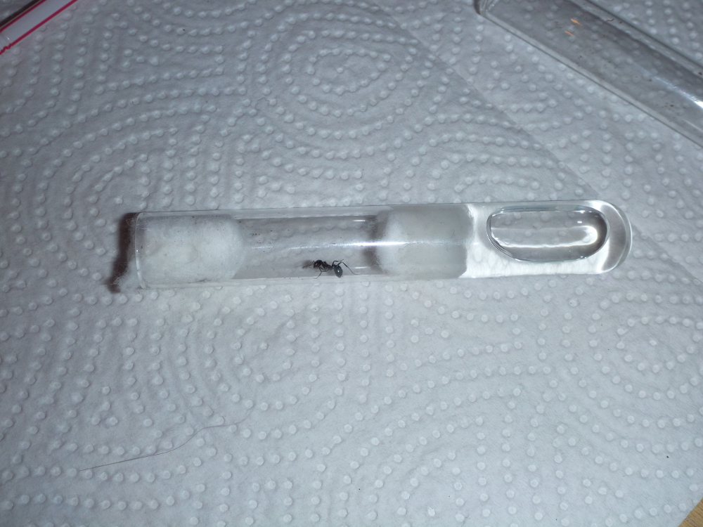 Jetzt müsst ihr nur noch eine begattete Ameisenkönigin hineinsetzen und den Eingang mit etwas Watte verschließen. Schon ist das Nest fertig. Wer mag kann es noch mit Alufolie oder mit durchsichtiger roter Folie abdecken, das bleibt aber jedem selbst überlassen. Wenn später die Arbeiterinnen schlüpfen oder ihr eine semi-claustral gründende Königin habt, dann könnt ihr den Wattestopfen entfernen und das Reagenzglas vorsichtig in die Arena legen, es kann dann eine ganze Weile noch als vollwertiges Nest dienen.