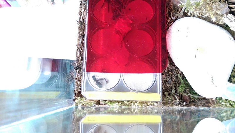 Nun noch eine rote Folie drauf, oder so wie ich eine rote Plexiglasplatte und ab ins Becken um zu sehen wie gut das Nest bei den Ameisen ankommt. Nach weniger als zwei Wochen war die Kolonie in das Nest eingezogen und verbrachte auch die Winterruhe dort drin. War im Nachhinein eine super Idee, da ich so leicht kondensiertes Wasser vom Deckel einfach abschĂĽtteln konnte ohne lang rumhantieren zu mĂĽssen.