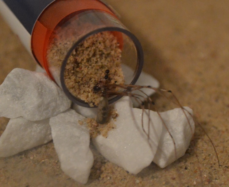 Wir schreiben den vierten Tag der Ameisenhaltung. Tatsächlich wurde die Spinne über Nacht ins RG gezogen und verputzt. Heute habe ich die Überreste vor dem Eingang des RG gefunden. Das wundert mich etwas, hätte ich doch damit gerechnet, dass die Ameisen die Essensreste in eine möglichst weit entfernt liegende Ecke der Arena schleifen würden. Ich habe gestern eine zweite Spinne nachgelegt (derzeit laufen hier anscheinend genug rum...). Sie wurde allerdings noch nicht angenommen.