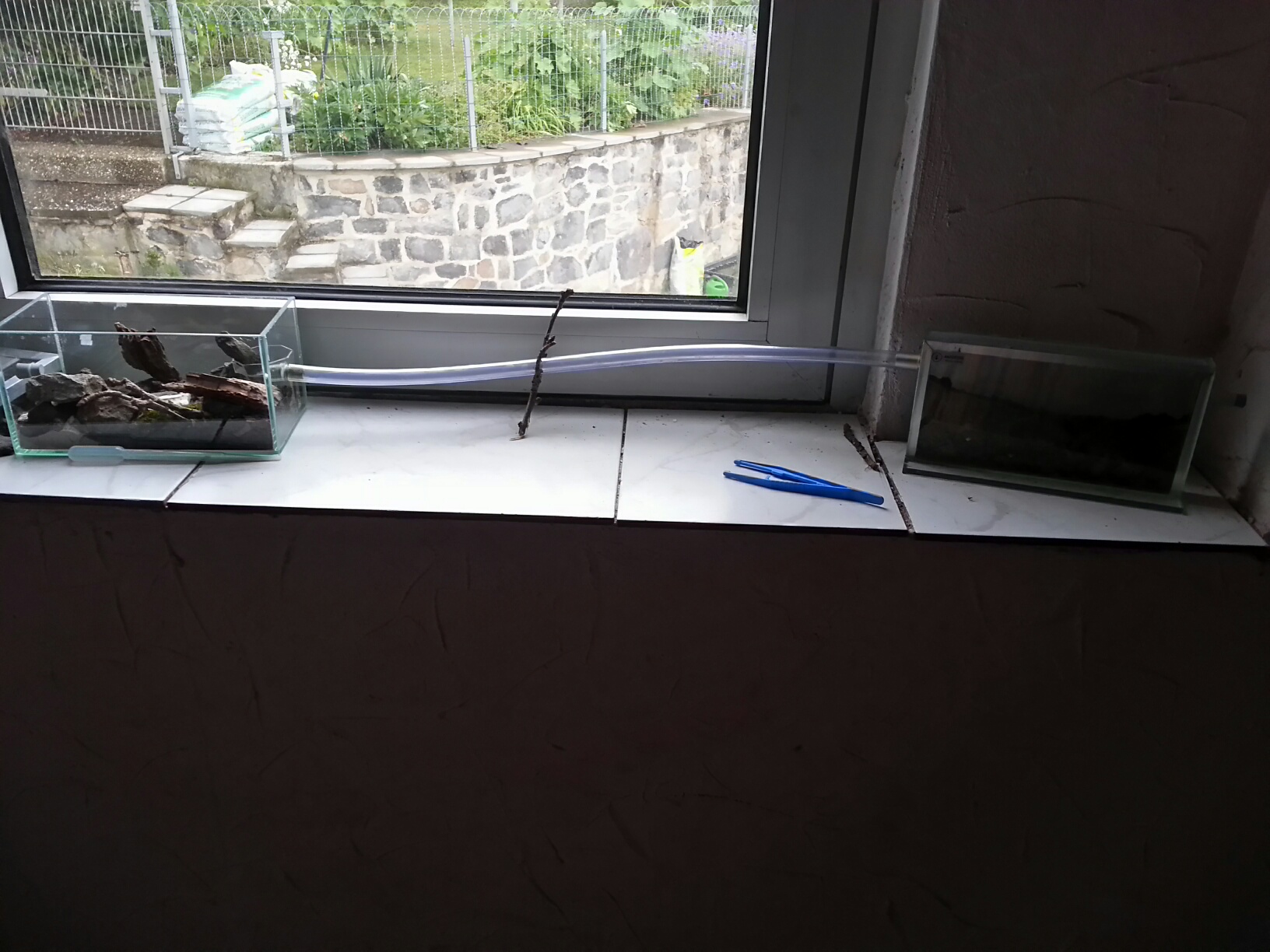 Seit den o.g. Schilderungen sind wir umgezogen. Das Formikarium ist an einem ruhigen Ort im nicht benutzten Treppenhaus vor einem Nordfenster. Das Nest ist zwar noch auf der Fensterbank, ist aber vor direktem Licht nahezu vollständig geschützt.