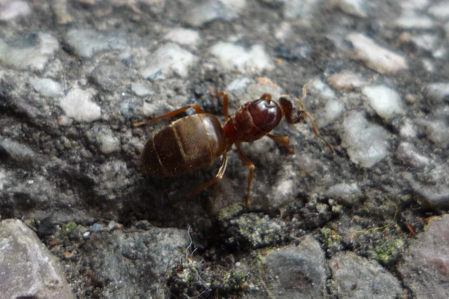 Lasius brunneus - die Königinnen sind an Kopf und Mesosoma dunkelbraun bis schwarz und am Gaster braun. Ich habe ein Nest von Lasius cf. brunneus in der Wand und ich habe den Eindruck, die Arbeiterinnen sind immer aktiv ...