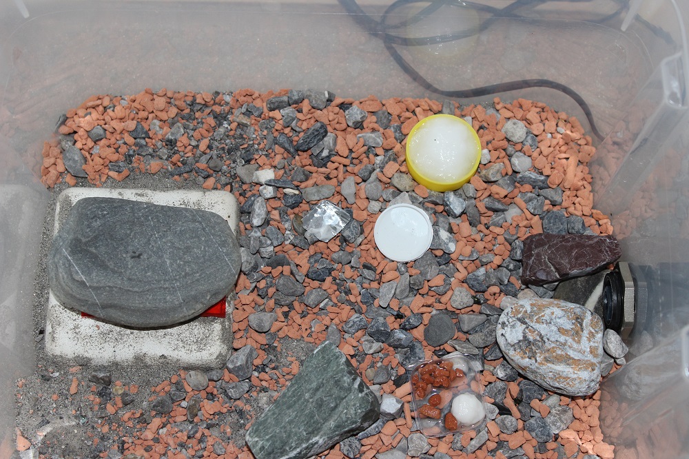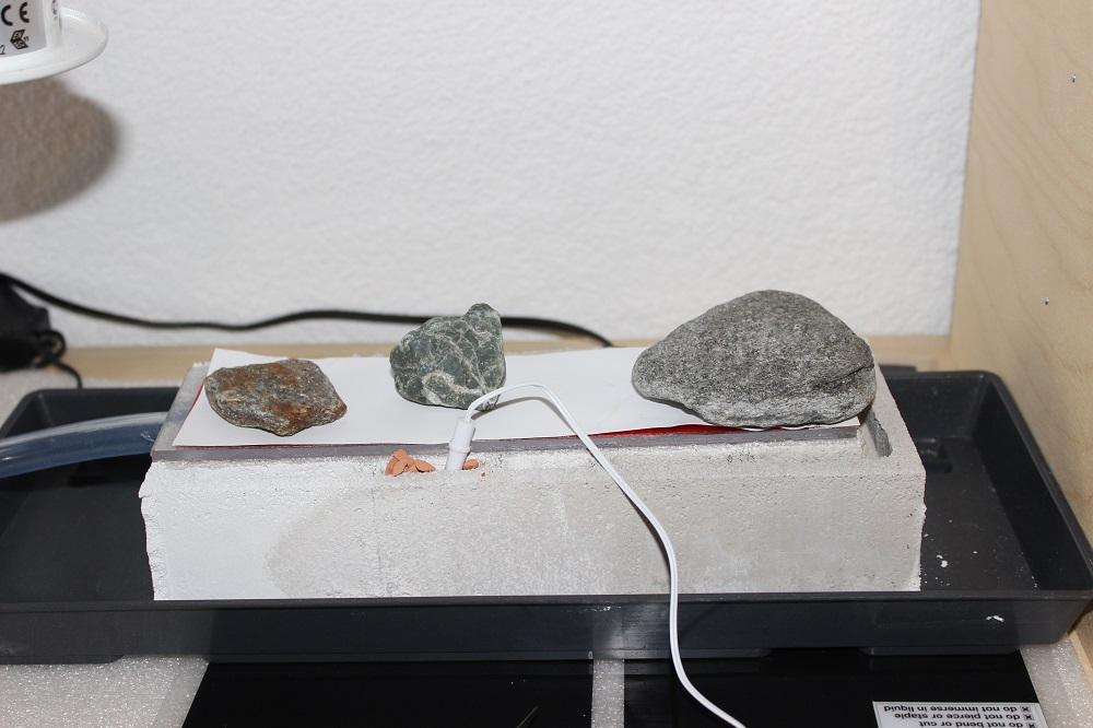 In der Folge stellte sich die Befeuchtung des Gipsnestes als ziemlich schwierig heraus. Wir haben keinen Tank gebaut, sondern wollten das Nest über den Arenaboden von unten befeuchten. Das haben wir aber nicht in den Griff bekommen. Entweder es war zu feucht oder zu trocken. Einmal wurde es so trocken, dass Manu alle