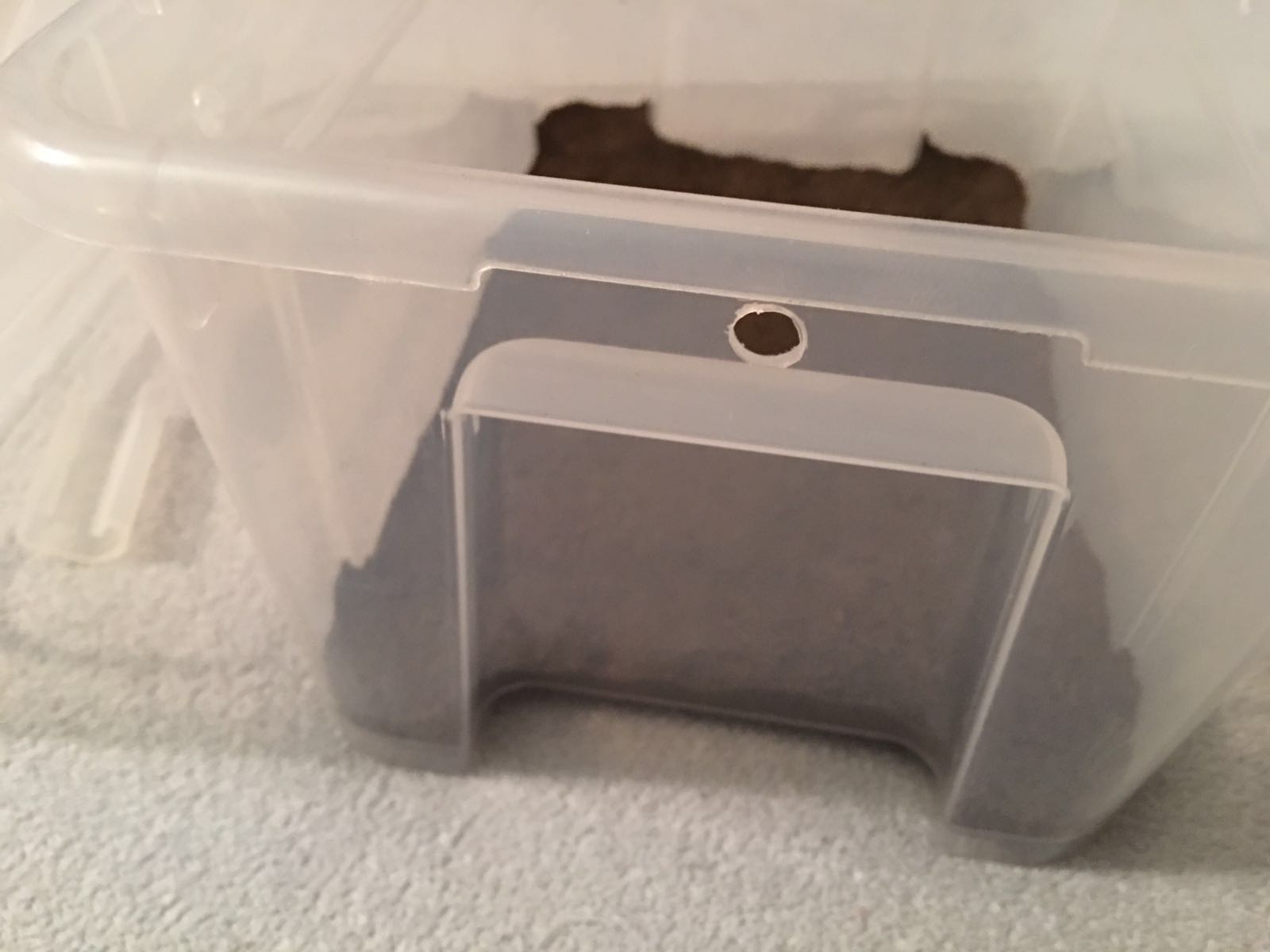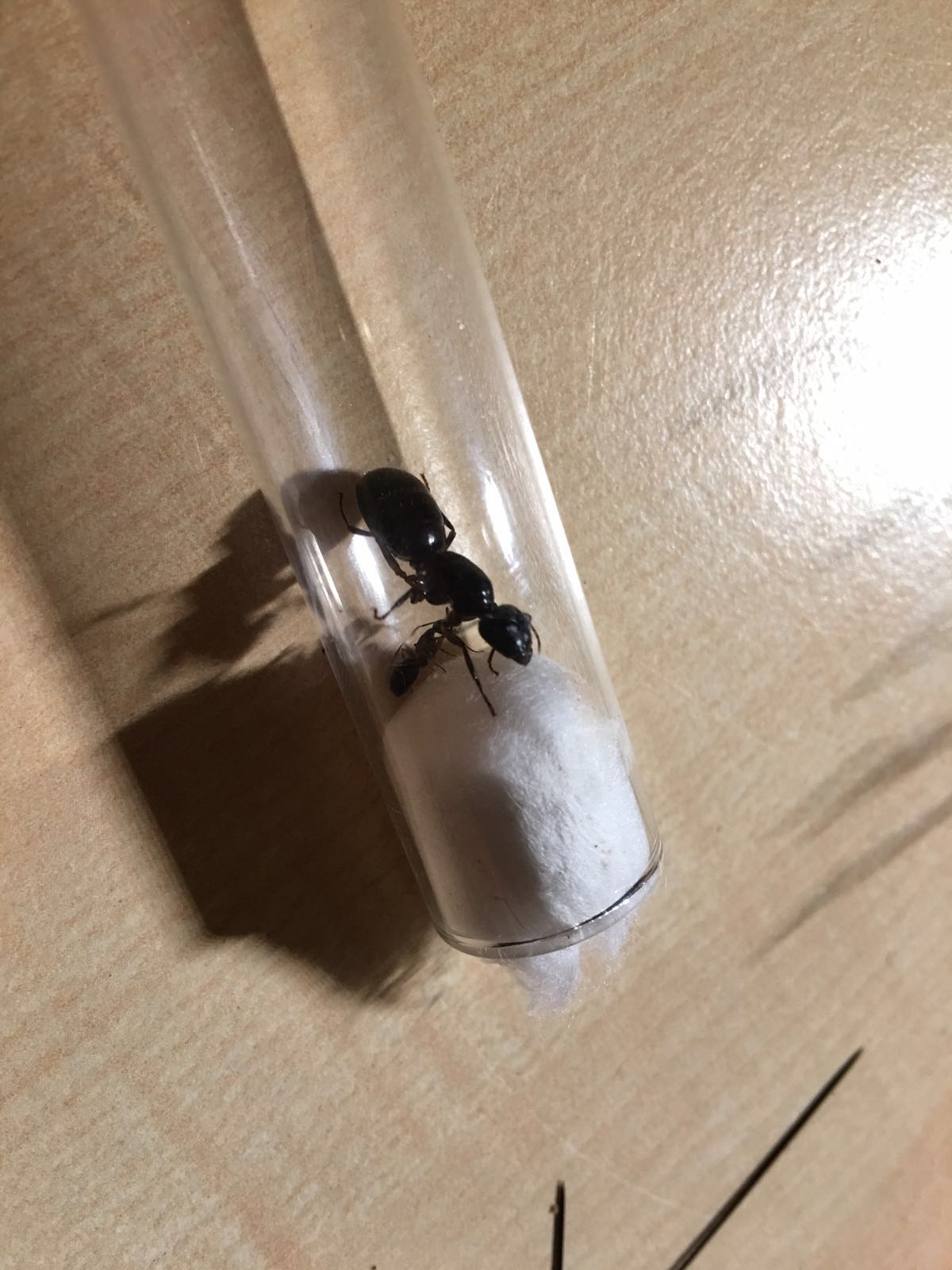 Gehalten wird die Kolonie in einer 5L Ikea SAMLA Box. Als Bodengrund habe ich Walderde/Lehm mit Sand gemischt und befeuchtet. Diesen kann man perfekt extrem hart und glatt pressen, er sieht naturnah aus, man erkennt die Ameisen gut und es speichert Feuchtigkeir extrem gut. Als Nest dient ein frisches RG. Tenperaturen sollten bei ca. 22-24 Grad liegen, habe sie aber schonend aufgewĂ€rmt und nicht direkt ins HeiĂe. Gleich gibt es erstmal etwas Honig. Zur LĂŒftung dienen ĂŒbrigens Luftlöcher oben an der Box, die haben wir zu sicherheit nochmal dĂŒnn mit Watte verstopft. Dann nochmal schön Parafin am Rand verteilt und Deckel drauf (der nochmal mit Knipsern befestigt ist. Aber bald bestelle ich wieder Formikarien aus Polen (sind praktisch die selben wie die vom deutschen bekannten HĂ€ndler, nur mittlerweile wohl die Ă€ltere Variante und viieell gĂŒnstiger) und dann wird meine Kolonie jedenfalls in ein schickes Becken ziehen. Mit einem externen Nest warte ich noch, aber ich habe schon eins geplant.