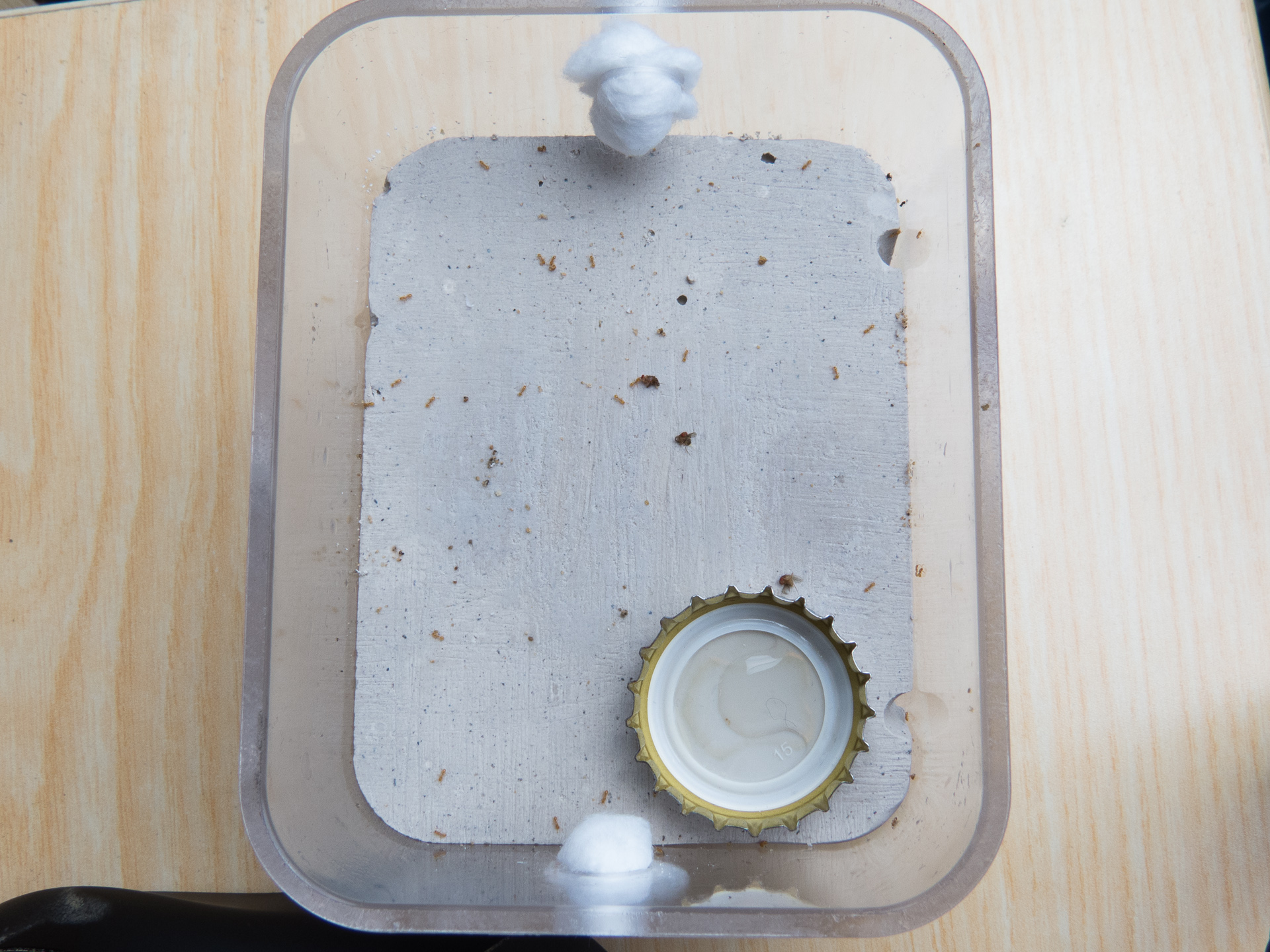 Um das Nest später bewässern zu können, habe ich ein Stück unten aus dem Gips gesägt und ein kleines Loch in die Box gebohrt, über welches ich dann mit einer Spritze oder einem kleinen Fläschchen Wasser hineingeben kann.
