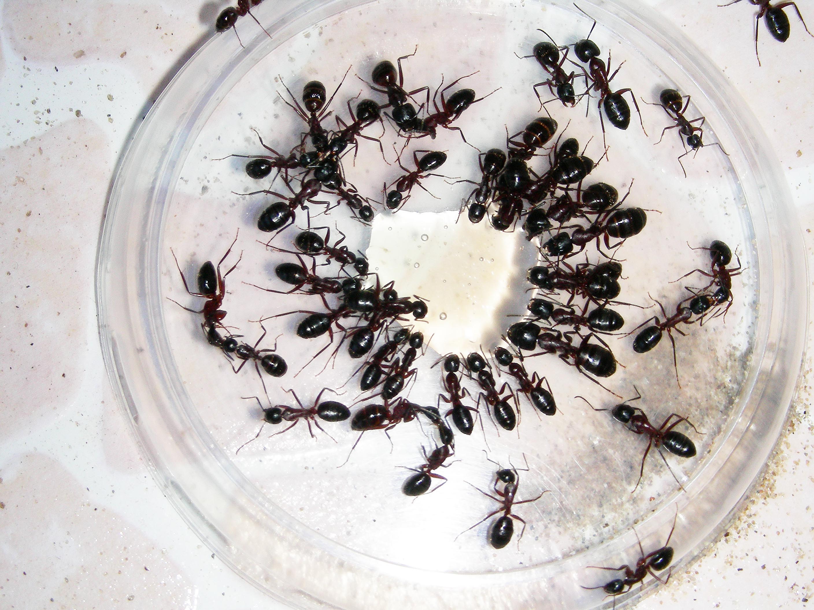 18.03.2011 Gab ihnen in den letzten Tagen immer wieder Insekten hinein die sie alle komplett verwendeten. Heute waren es kleinere Insekten und zwar 90 Essigfliegen - mit denen sie aber bis zum Abend (bis auf ein paar wenige) nichts anfangen konnten - deshalb wieder entfernt. Hoffe ich merke mir das die Camponotus nichts mit den Essigfliegen anfangen können.