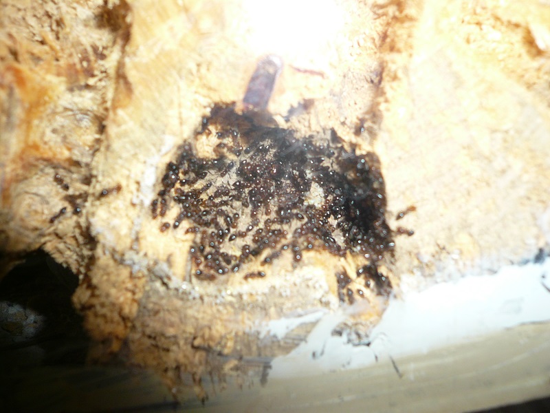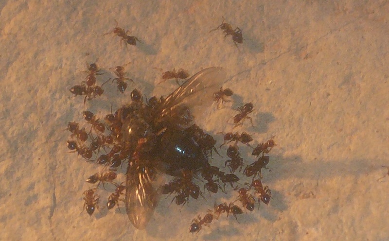 Gyne legt wohl Eier ohne Ende, denn wie man auf den Fotos sieht, benutzen sie diese sogar als Baumaterial, um den Nesteingang zu verengen. Das schlägt sich auch im Proteinbedarf nieder: Ich hab das Gefühl, ihren Futterbedarf nie ganz decken zu können, jedenfalls ist es noch nicht passiert, dass sie eine Fliege verschmäht haben, weil sie keinen Hunger mehr hatten und sie stürzen sich auf jede Fliege, die ich ihnen in das (übrigens in der
