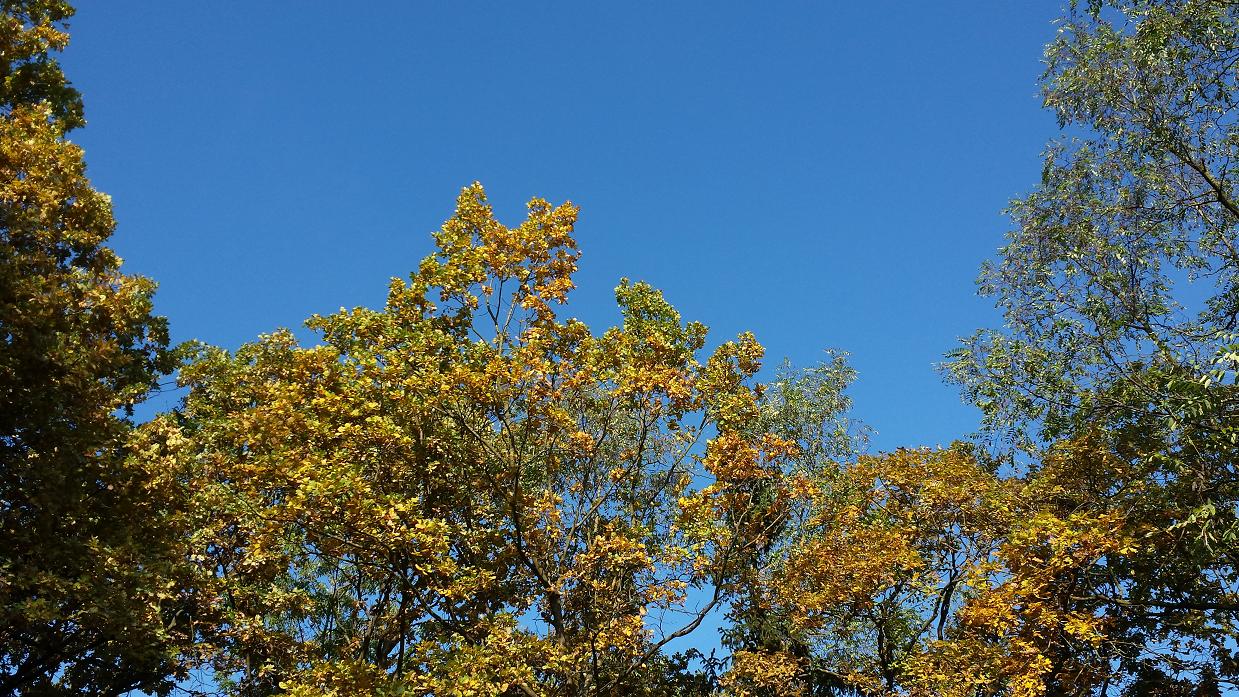 Zweimal blieb ich wĂ€hrend der Arbeit kurz stehen und hielt inne und genoss diese absolute Ruhe... dabei entstanden jeweils die nĂ€chsten zwei Fotos. Ich weiĂ, nicht der groĂe Renner, aber alleine die Farbkombination gefiel mir sehr gut. Der wolkenlose, schön blaue Himmel im Kontrast zum gelben Herbstlaub der Eichen wie auch die Sonnenstrahlen in den Baumkronen.