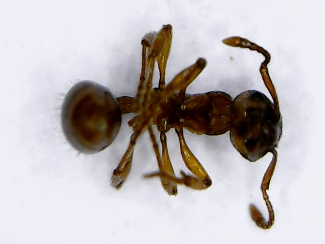 Allerdings sind sie nicht gleich groß wie Myrmicasp . Meistens um die Hälfte kleiner, und naja, die zwei Dornen am Thorax wirken etwas untypisch lang für diese Gattung . Dann kommt noch hinzu, dass Thorax stärker gebaut ist und eigentlich an eine Gyne erinnert. Aber was sollen die in größerer Zahl gerade bei der Myrmica sp . Kolonie machen? Semmel suchen?
