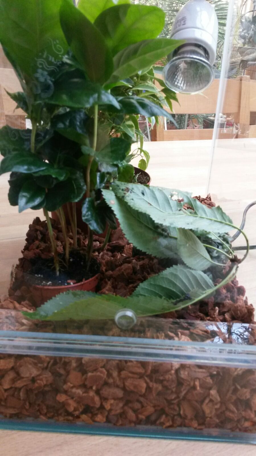 Das erste Bild ist noch in der Bananentüte, als unser kleiner Asylant von der Elfenbeinküste ankam und das 2. Bild ist von heute an der seitlichen Galsscheibe.