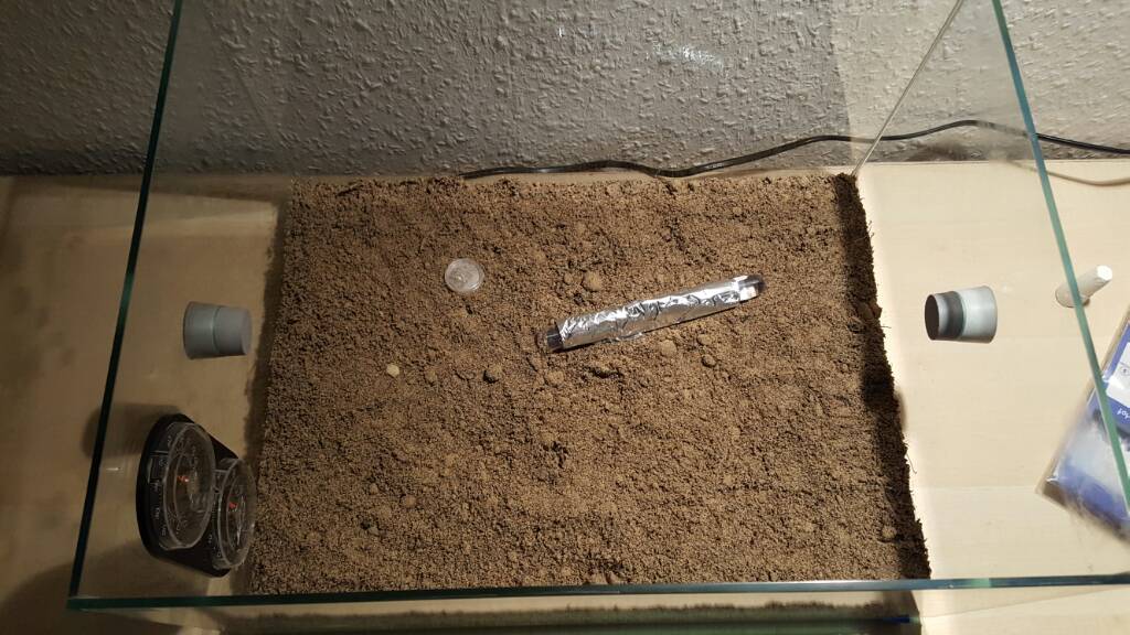 Wie ihr seht biete ich momentan noch kein Nest an, das Reagenzglas sollte noch eine Weile ausreichen. Wenn das aus allen NĂ€hten platzt habe ich vor ein kleines Gipsnest auĂerhalb der Arena anzubieten (wiederum mit integrierter Heizmatte).