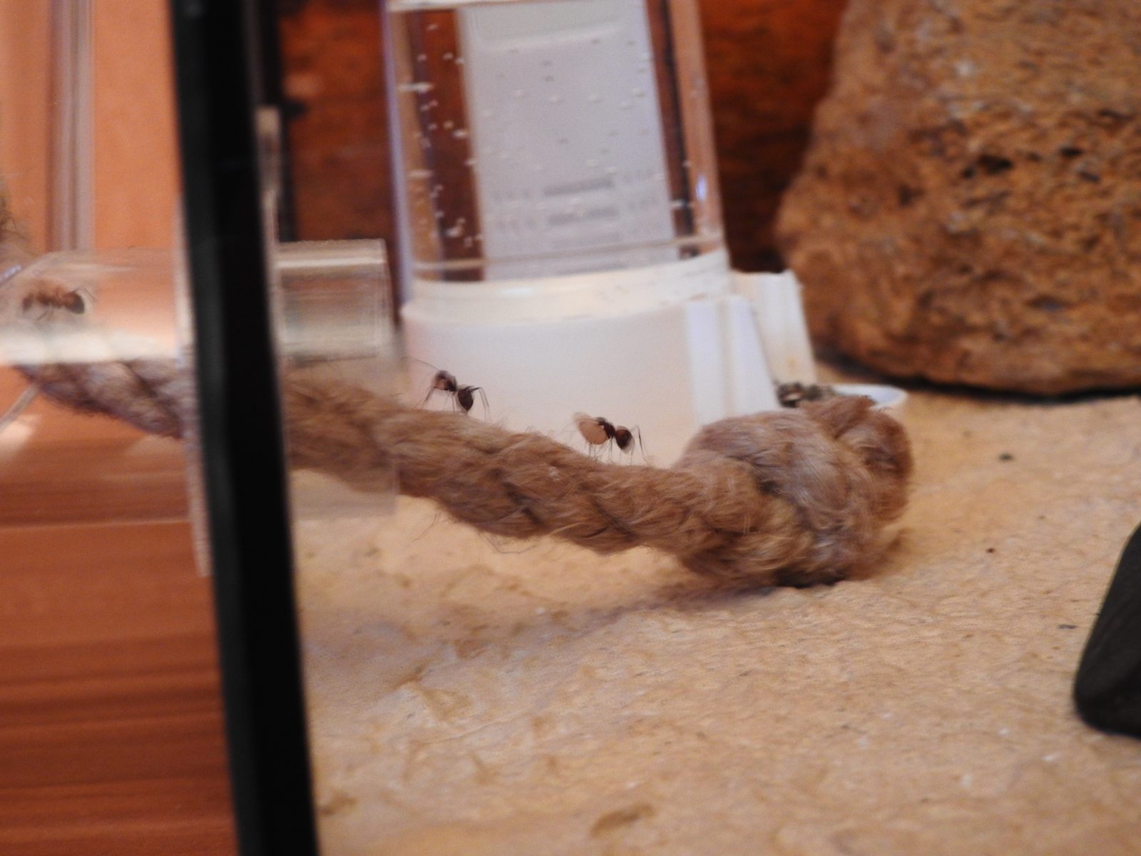 Der Rekord an Aktivität, seit dem Umzug ins Nest, wurde vorgestern aufgestellt. Ich konnte fünf Arbeiterinnen nacheinander zählen. Zuerst sind zwei einzeln herunter gekommen und haben an der Mehlkäferpuppe geknabbert, kurz darauf ist eine Armada, bestehend aus drei Arbeiterinnen, das Hanfseil gleichzeitig herunter in die Arena geklettert.