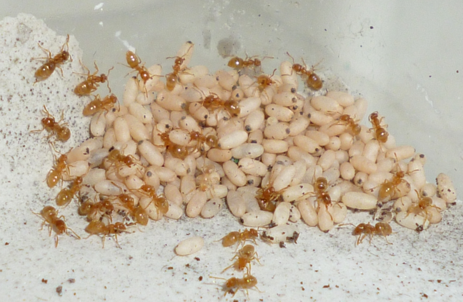 Die Kolonie besteht nach wie vor aus zwei Königinnen und inziwschen 40+ Arbeiterinnen. Es ist viel Brut in allen Stadien vorhanden. Innerhalb des RGs haben sie sich nah am Wassertank aus der Muttererde eine kunstvolle Konstruktion aus mehreren Ebenen gebaut. Die Einsicht ist zwar dadurch etwas beeintrĂ€chtigt, aber die Ameisen scheinen sich so sehr wohl zu fĂŒhlen. Meine momentane Kamera ermöglicht derzeit leider keine scharfen Aufnahmen des Nistbereichs.