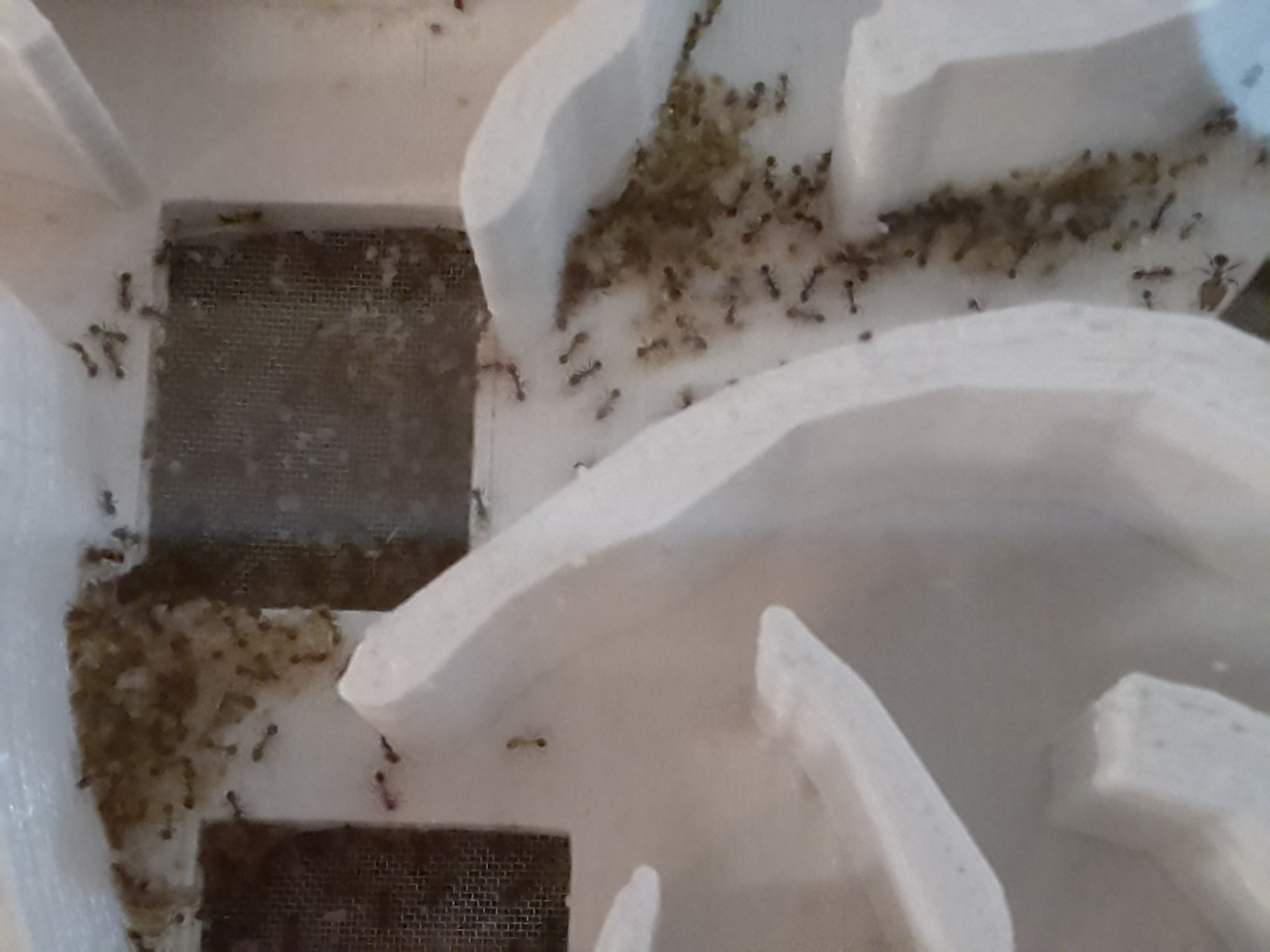 Tag 7. Unsere Damen haben gestern in Scharren das 3D-Nest erkundet (wir haben es zur Heizung gestellt und von unten befeuchtet). Zu erst dachten wir, dass sie das Gitter im Nest irgentwie entfernt haben, um nun einen Ausbruchsversuch zu starten... aber wir lagen Falsch!- Sie sind umgezogen Hier ein paar Fotos während des Umzugs: