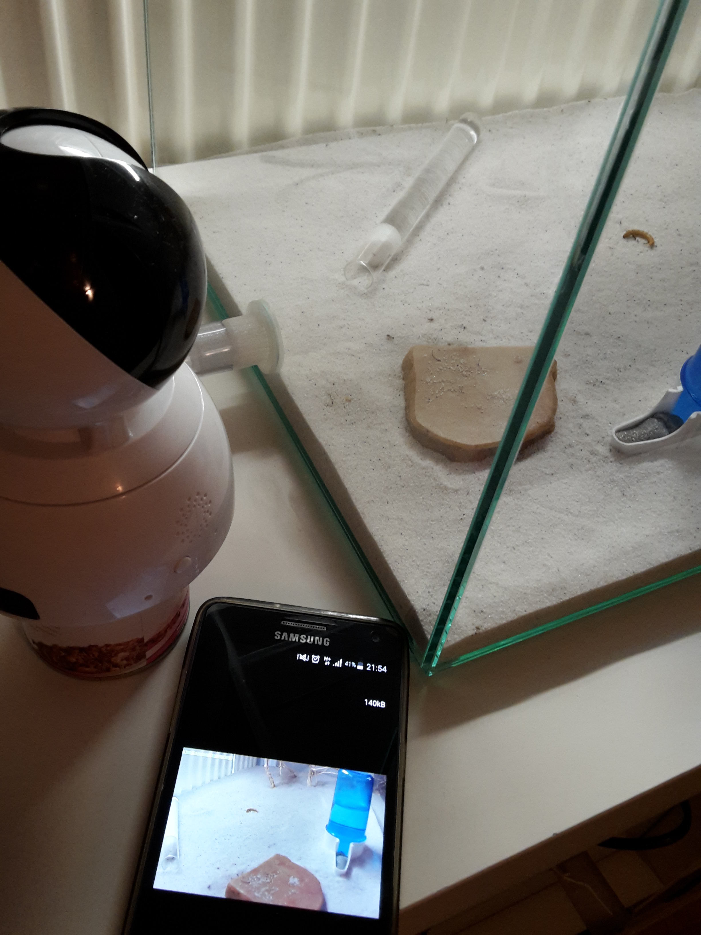 Tag 13. Hallo zusammen, da sind wir wieder Wir haben unsere Ameisen natürlich die Tage über nicht ganz unbeobachtet gelassen Zu Weihnachten hat mein Freund eine 360° Kamera von seinen Eltern bekommen... Über eine App lässt es sich auf die Kamera zugreiffen und diese steuern, auch der Sprachaustausch über die Kamera ist möglich. Aussehen tut das Ganze so: