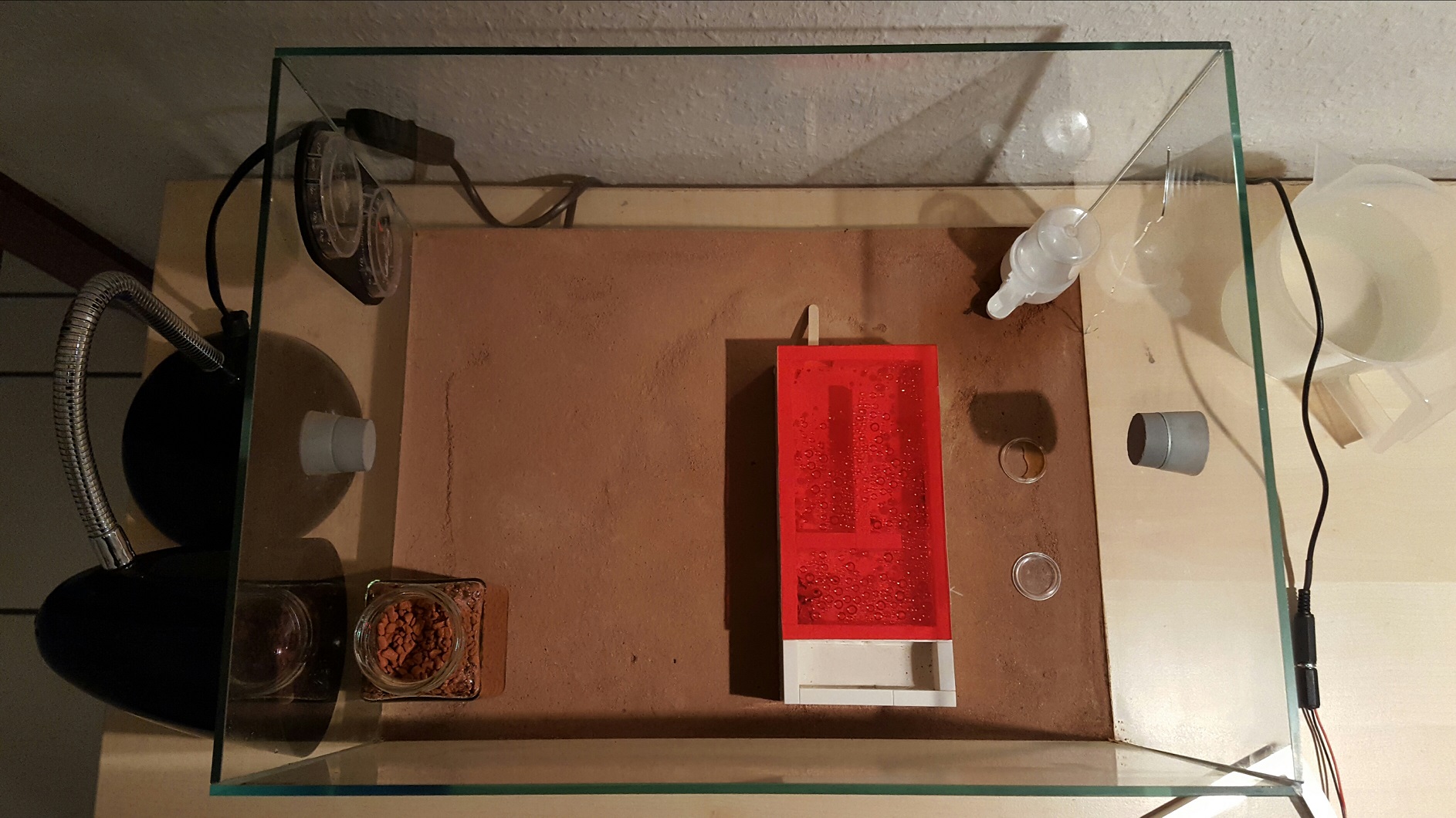 Ich musste in den letzten Tagen immer mal wieder was am Setup ändern, da mein Urlaub die komplett durcheinander gebracht hat. Als sie ihre Brut einfach ins Freie (über die Heizmatte, die nur unter der linken Seite des Beckens installiert ist) gelegt haben, hab ich Ihnen das Nest also auf die Heizmatte gestellt. Das ging zwei Tage gut - danach musste ich aber beobachten, dass sie ihre Brut nachts an einen kälteren Ort (neben der Wassertränke) gebracht haben. Es wurde denen also scheinbar zu warm im Nest. Zusätzlich hatte ich Probleme mit meiner Wärmelampe, da diese die Seitenscheibe zum springen gebracht hat. Es ist zwar alles noch dicht, die Wärmelampe musste ich aber deswegen auch umstellen.
