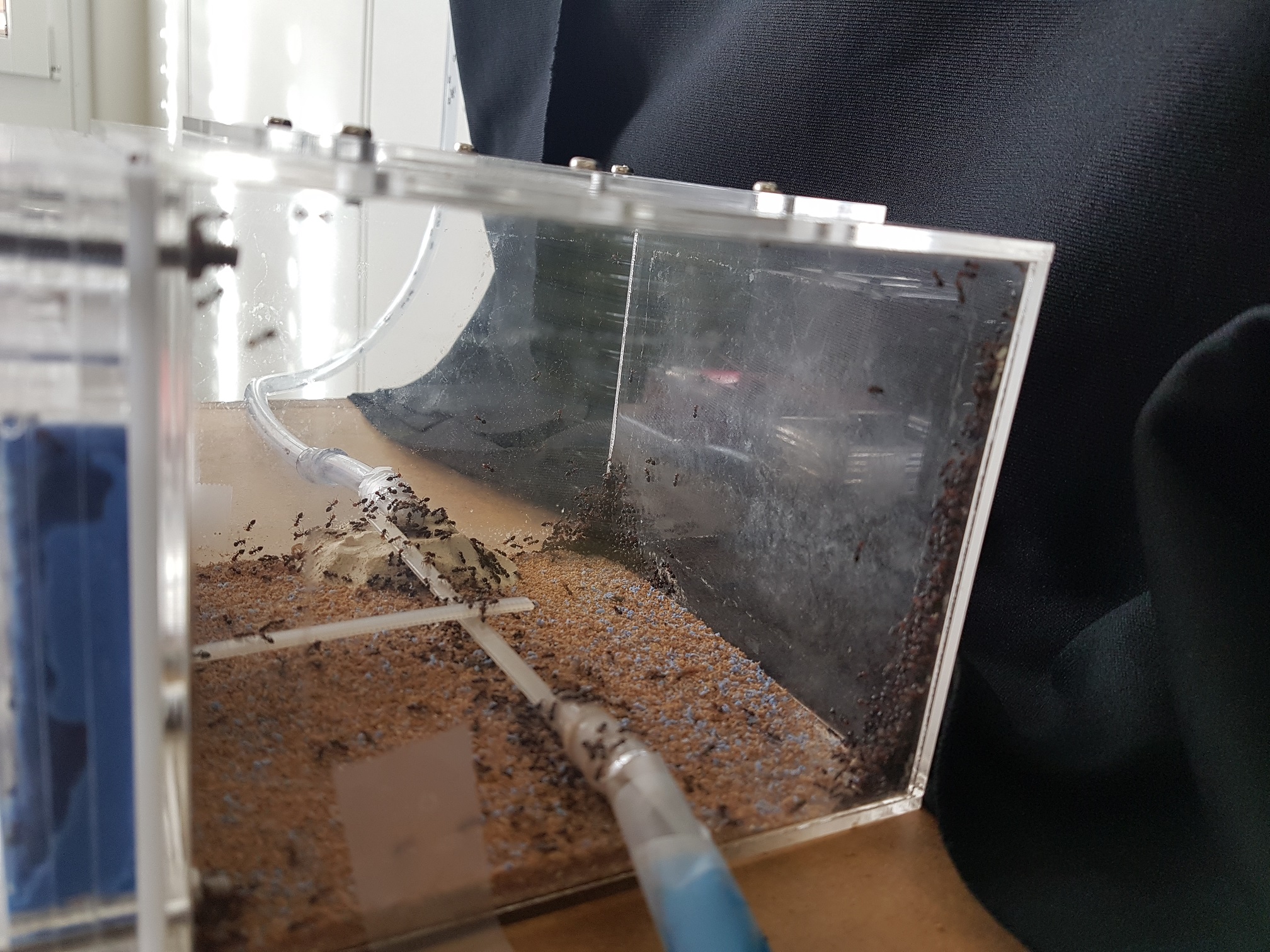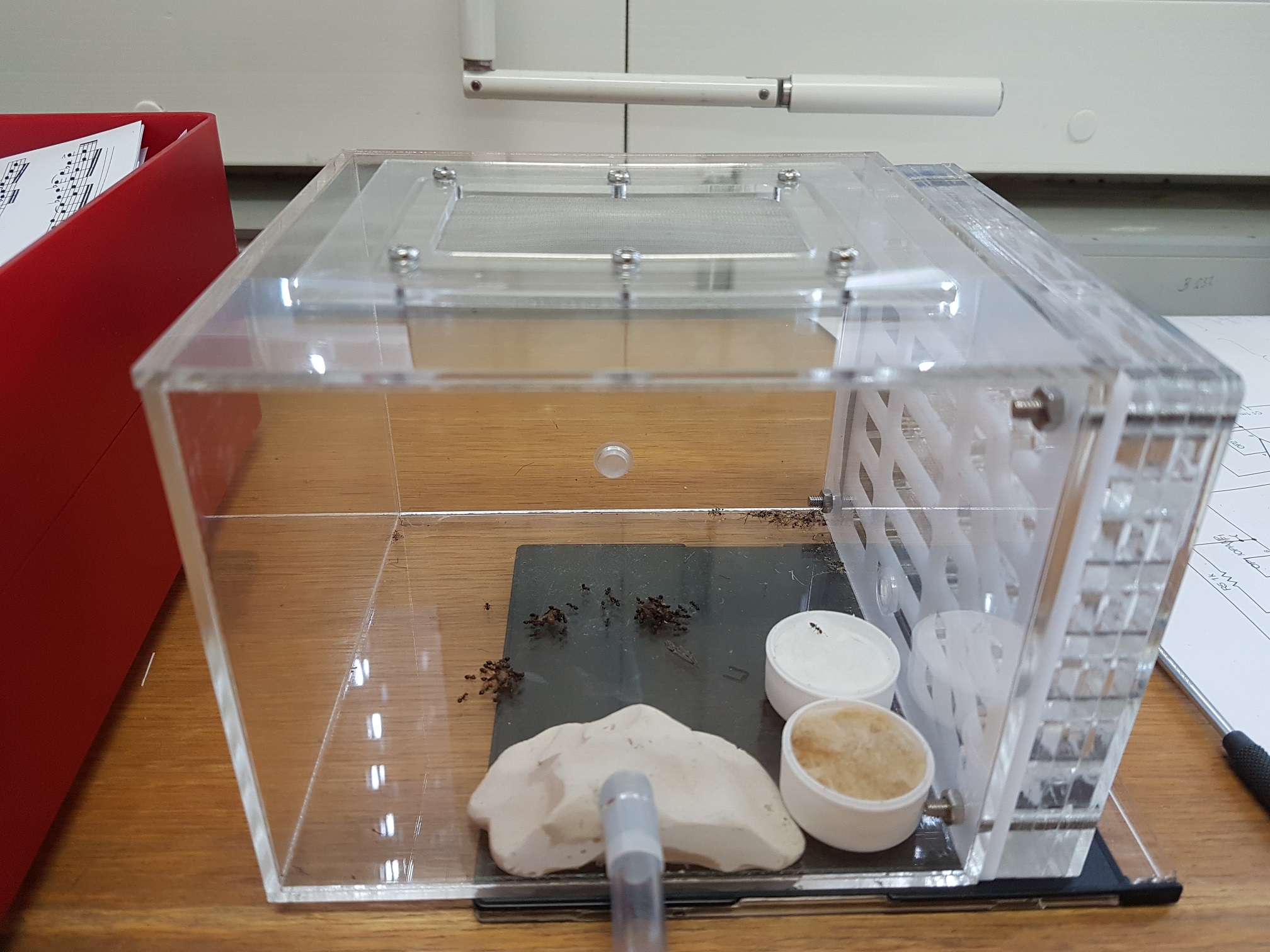 Im September war ich 3 Wochen im Campingurlaub auf Sardinien. An unserem letzten Tag vor der Abreise krabbelte da diese hübsche junge Lady über unser Vorzelt des Campers. Da ich aber schon meinen Vorrat von 4 RG ein paar Tage vorher beim Hochzeitsflug der Messor spec aufgebraucht hatte, musste ein bisschen improvisiert werden. Ich hatte von einem Fiebermesser das Schutzröhrchen (welche auf beiden Seiten Lüftungslöcher hat) verwendet, indem ich es am einen Ende mit Watte auskleidete und in einen Becher mit Wasser stellte. Aber nur so, dass die Watte sich aufsaugen konnte. Es war sicherlich nicht ganz ideal, aber wie sich nun herausstellt, hat die