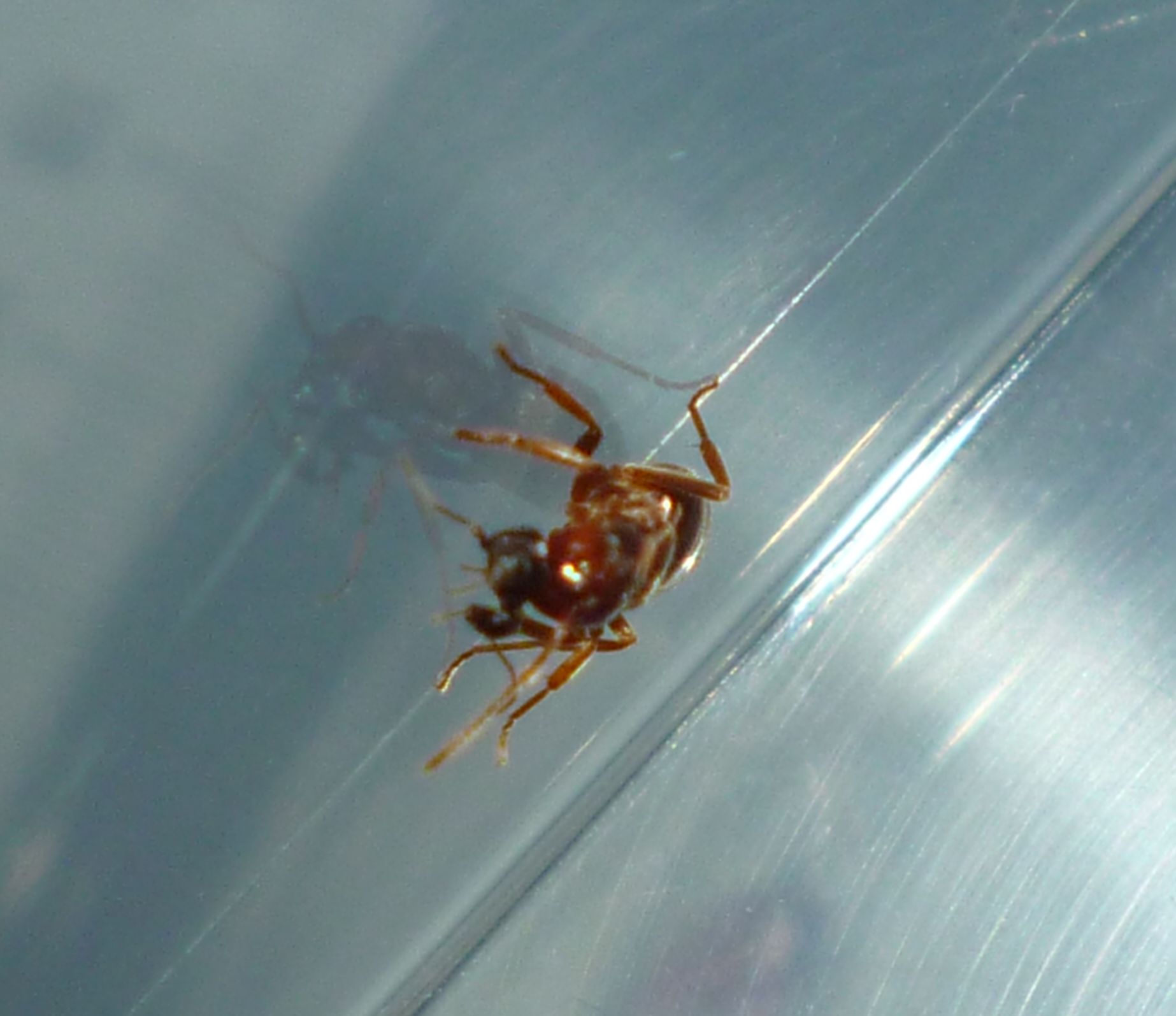 Es folgten erste Kontakte mit den Lasius niger-Arbeiterinnen, wobei beide stets zurückwichen und sich voneinander entfernten. Wir hatten den Eindruck, dass sich das Verhalten der
