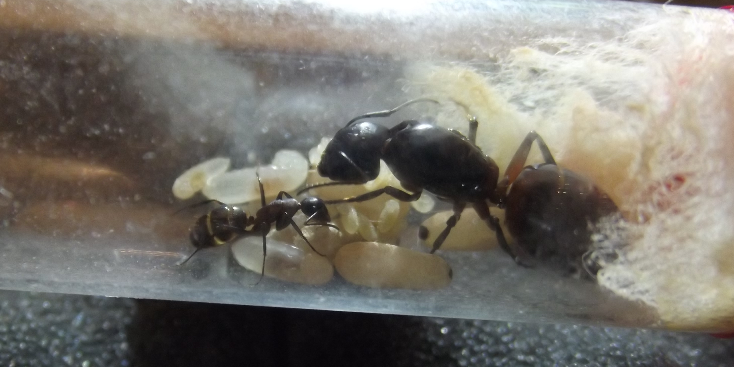 Die Tage hatte ich auch das Glück und konnte meine Königin dabei beobachten wie sei ein Ei legt. Ihr Gaster war noch vorne gerichtet, es sah fast schon so aus als würde sie sitzen. Ich habe es erst gesehen als das Ei schon zur Hälfte heraus war, der restliche Vorgang ging relativ flott. Das Ei "glitt" langsam heraus und nach ca. 30 Sekunden war das Ei draußen und lag auf dem Boden. Die nächsten 10 Minuten schenkte keine einzige Ameise dem Ei Aufmerksamkeit, bis es von einer Arbeiterin entdeckt und zu den anderen Eier getragen wurde.