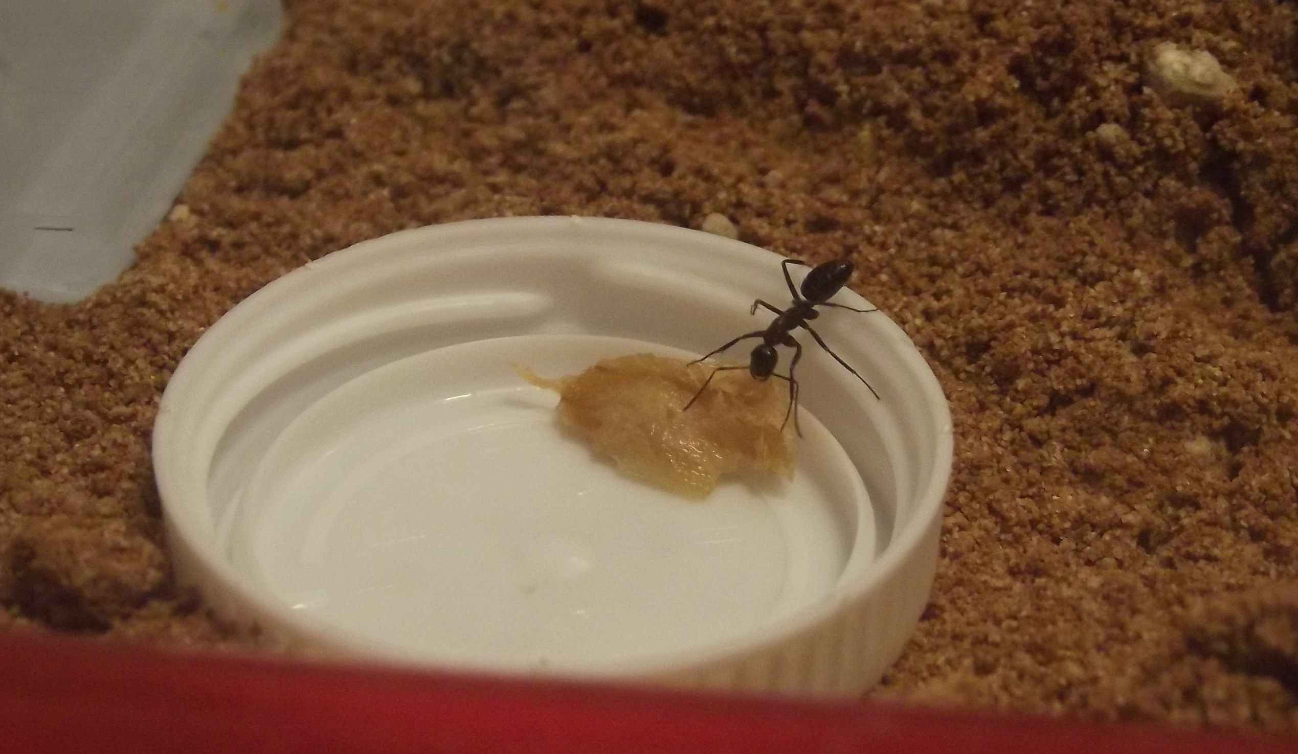 Gestern habe ich ihnen ein Stück Thunfisch angeboten, welches auch nach ca. einer Stunde in das Nest getragen wurde. Dazu gab es noch die vordere Hälfte eines Mehlwurms, auch dieser kleine Mahlzeit wurde nach kurzer Zeit in das Nest gebracht. Der Mehlwurm wurde mittlerweile fleißig ausgehöhlt und der Thunfisch wird immer mal wieder von einzelnen Arbeiterinnen angeknabbert.