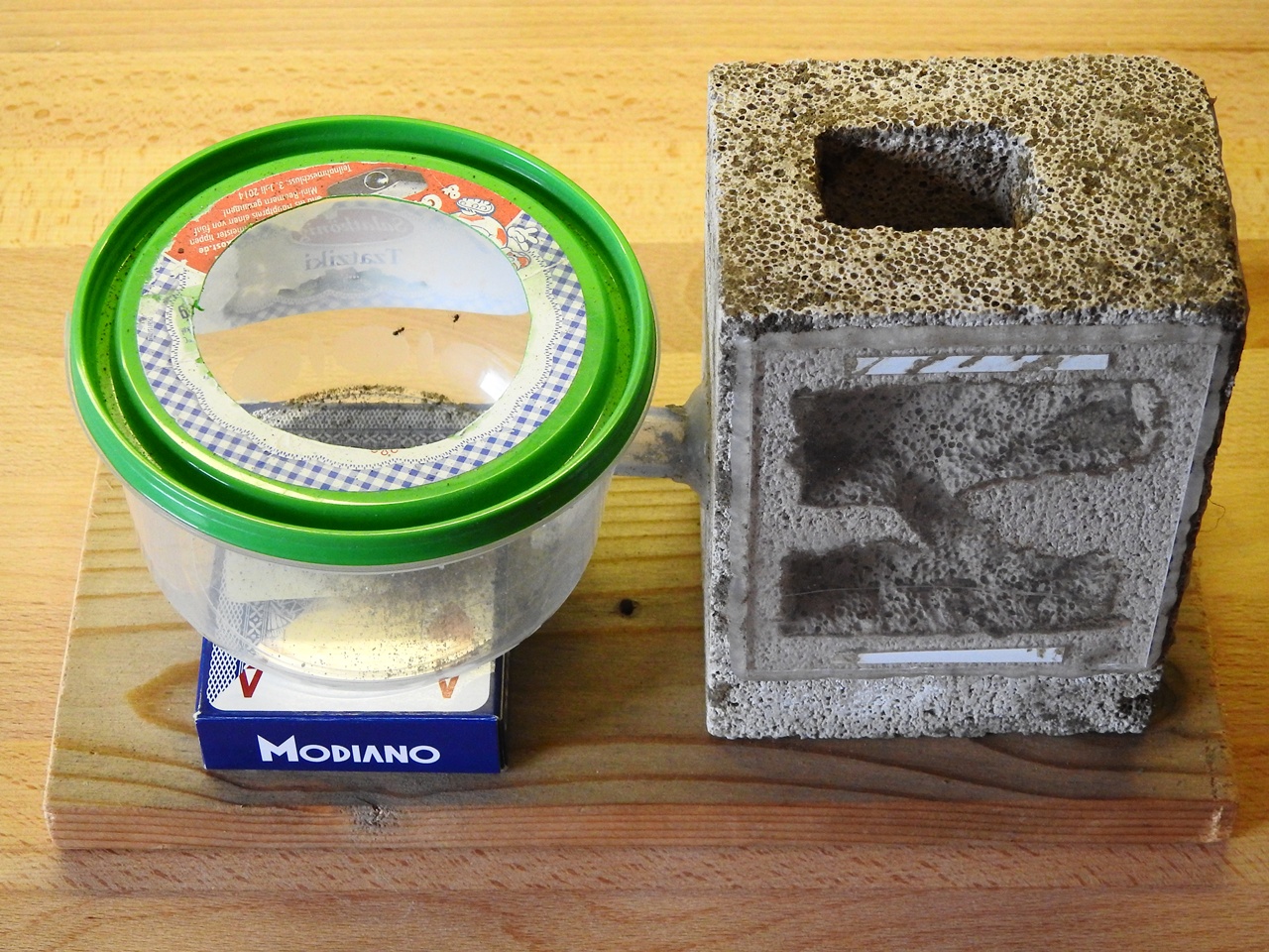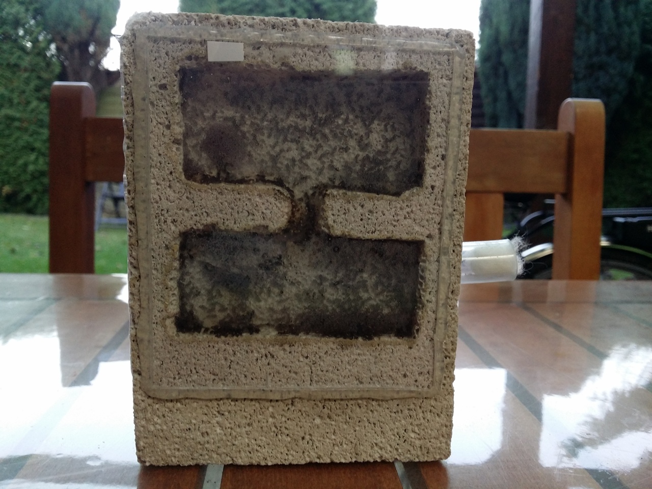 An den Scheiben hat sich viel Kondenswasser gebildet. Die Ameisen sind zum Teil in den Zwischenraum der Scheibe und der Trittplatte gewandert. Auf dem Bild nicht zu erkennen, die vielen Ameisen im Hohlraum am Nestblock. Ich vermute den Großteil der Kolonie im unteren Teil des Y-Tong Steins.