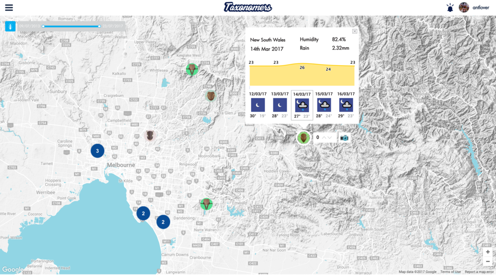 Jeder User kann dort Fundorte mit Fotos und Infos zur Jahreszeit, Tageszeit und zum Wetter (Es wird ein Wetterdiagramm mit dem Wetter 2 Tage vor dem Fundtag und 2 Tage danach angezeigt) zur Zeit des Fundes eintragen. Außerdem ist es möglich bestimmte Filter anzuwenden. Somit kann man zB auch speziell nach SchwarmflĂŒgen im Mai suchen oder nur nach Lasius ausschau halten. Die Karte ist Weltweit und wird jetzt schon gut gefĂŒllt.