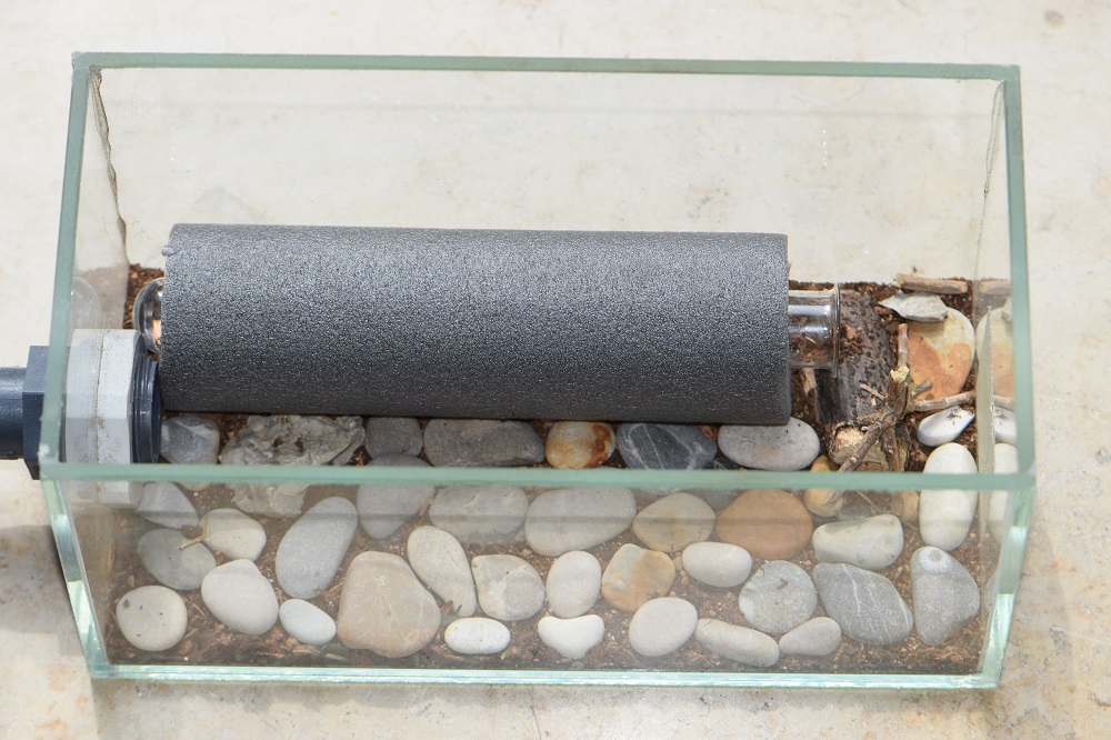 Momentan besitze ich 2 Arenen. Die große Arena (ca. 55 x 35 cm) hat 2 Ausgänge und es gibt einige Kunstblumen sowie Äste als Deko. Diese wird dieses Jahr aber wahrscheinlich nicht zum Einsatz kommen, was mir bewusst ist. Deswegen gibt es noch eine kleine Arena (ca. 35 x 25 cm) ohne Ausgänge und nur mit einigen Ästchen als Deko. Der Bodengrund bei beiden Arenen besteht aus einer Seramis-Schicht und oben drauf einer Aquarienkies-Schicht.