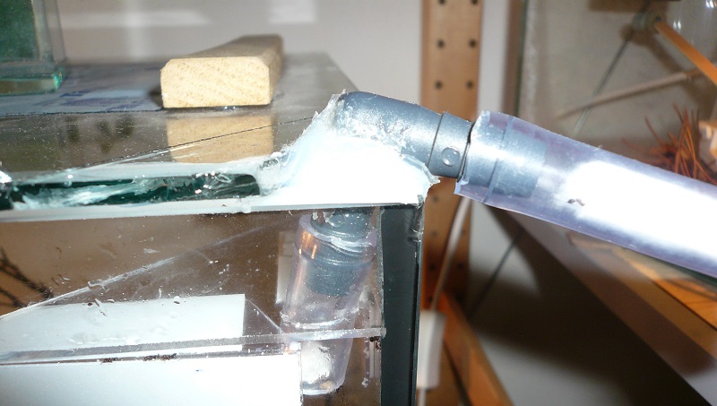 - "Ausgangspfusch": Da das Becken keine Bohrungen hat, befindet sich der Ausgang oben in einer Ecke. Ein Schlauchstück führt auch durch den Paraffinölrahmen. Aktuell ist der Ausgang übrigens zu.