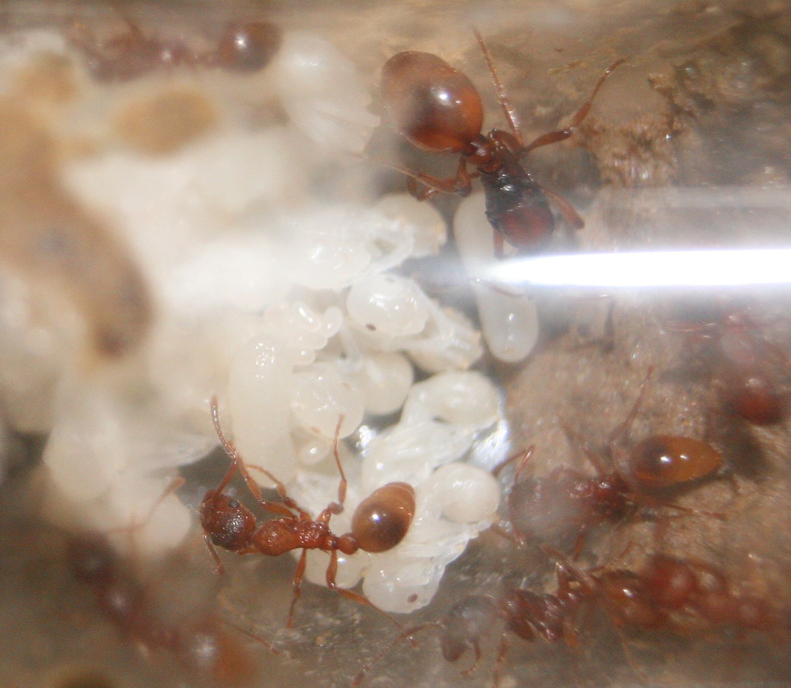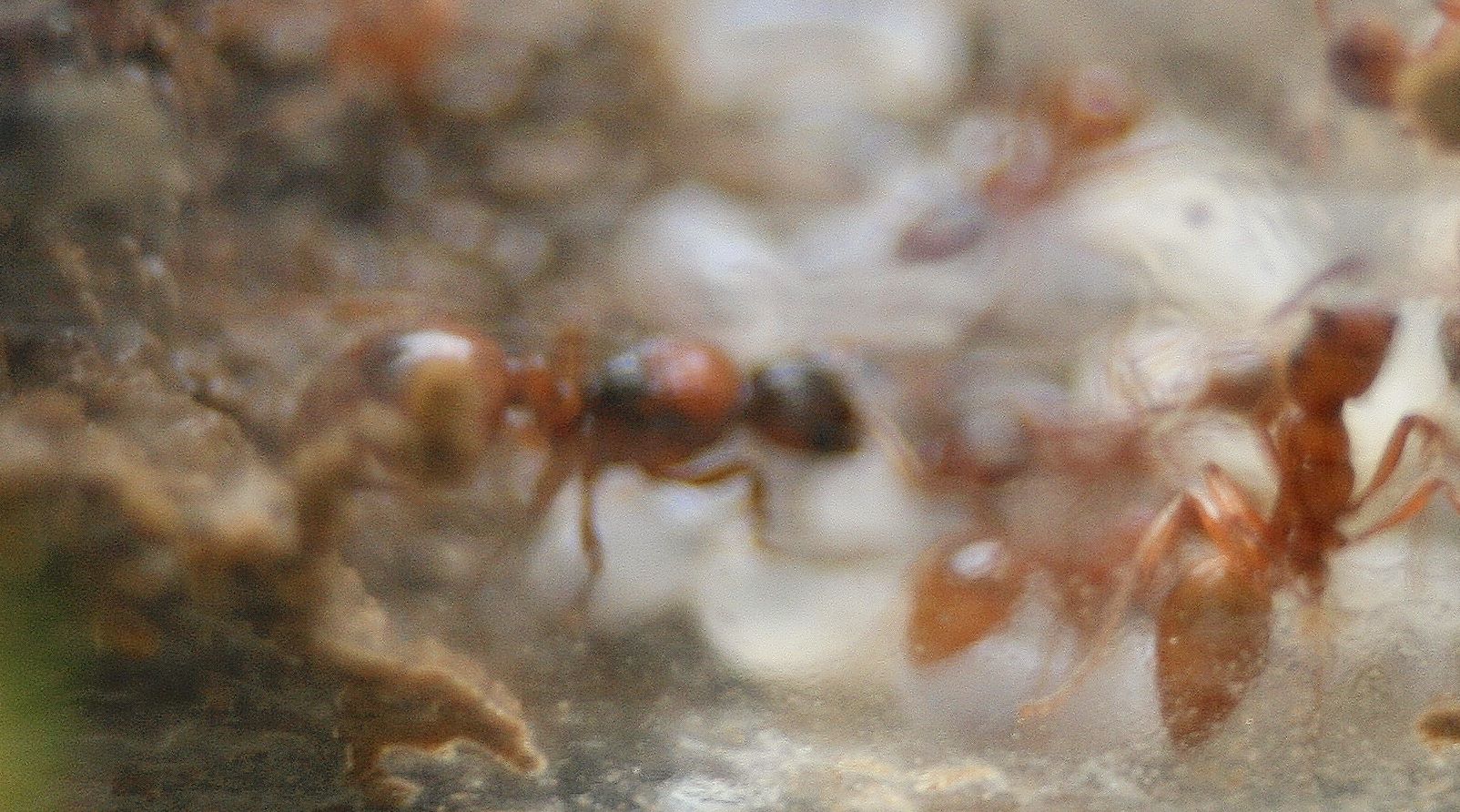 Zuerst haben ca 10-15 Arbeiterinnen sich um sie versammelt, "befĂĽhlt" usw. Nach einiger Zeit wollten die Arbeiterinnen die beiden in ihr Nest bringen.