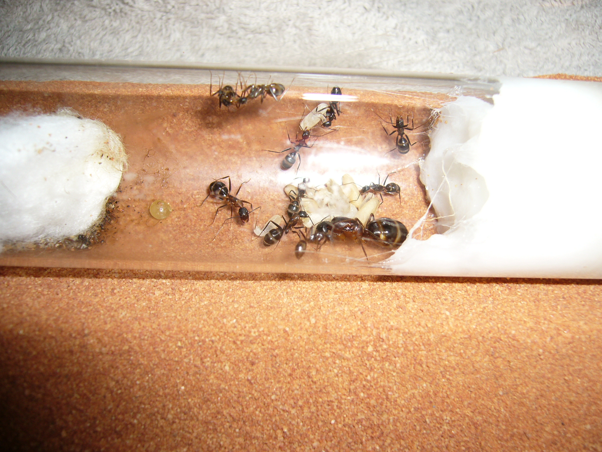 Wollte ihnen ein neues Glas anbieten, das war aber nicht ganz dicht und der gesamte Inhalt (30x200mm RG) floss in die Arena. Hat zwei Tage mit der Wärmelampe gebraucht um die Luftfeuchtigkeit von 70% auf den Normalwert von 40-50% runterzubekommen. Die Ameisen hats nicht gestört.