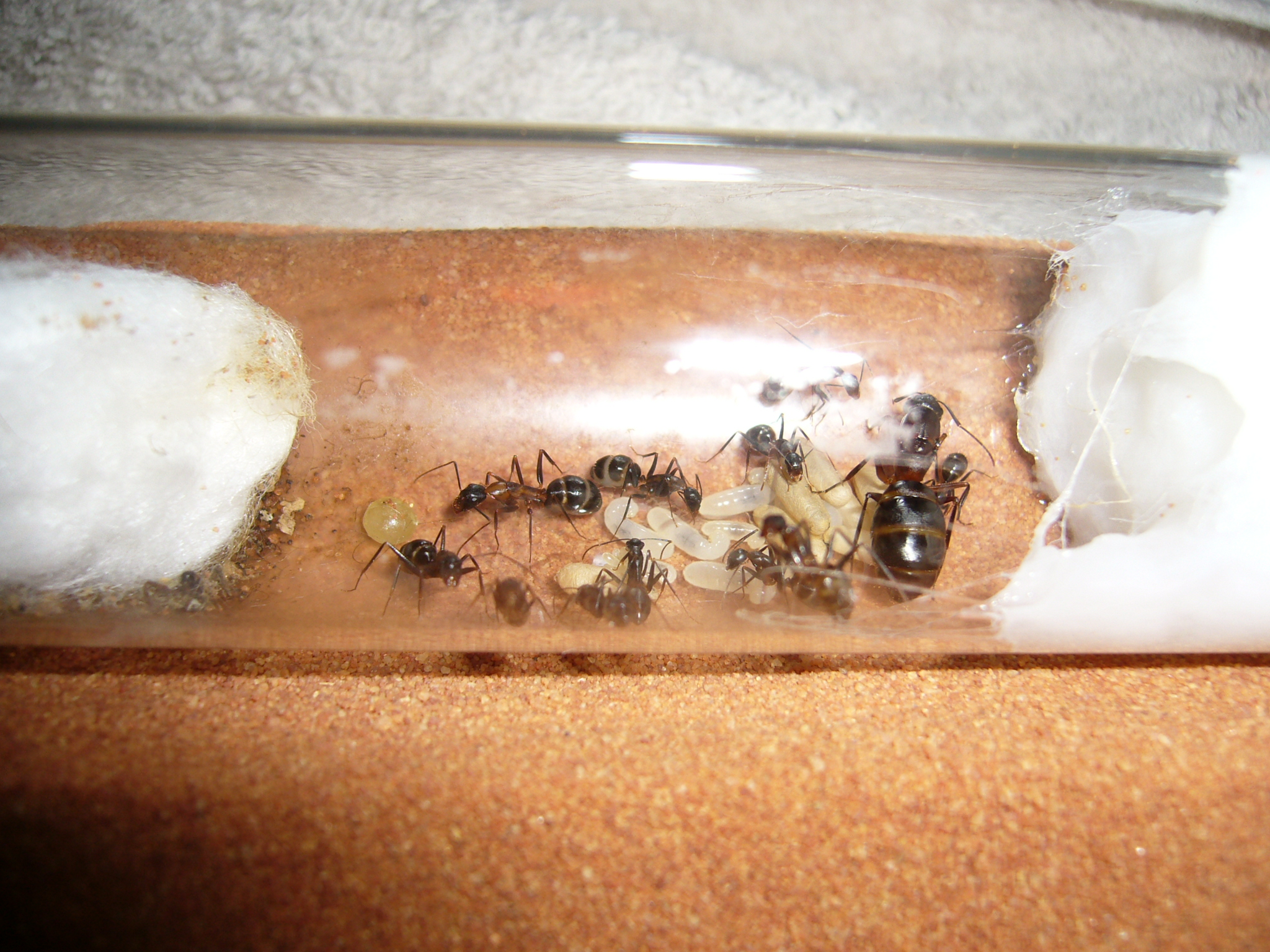 Wollte ihnen ein neues Glas anbieten, das war aber nicht ganz dicht und der gesamte Inhalt (30x200mm RG) floss in die Arena. Hat zwei Tage mit der Wärmelampe gebraucht um die Luftfeuchtigkeit von 70% auf den Normalwert von 40-50% runterzubekommen. Die Ameisen hats nicht gestört.