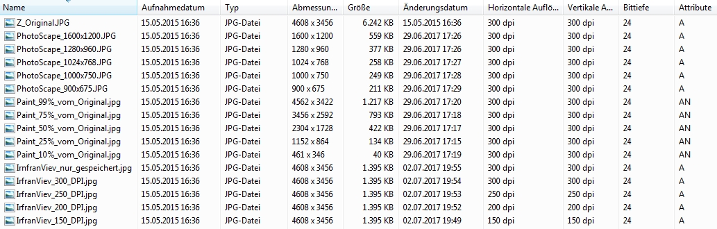 Richtig, das Stichwort was hier im Thread noch gefehlt hatte ist die jpg-Kompremierung. Ich habe für die Bilder, welche mit IrfranView gespeichert wurden, sogar eine m.E. recht starke Komprimierung von 80% benutzt. Eine deutliche Qualitätsminderung kann ich trotzdem nicht feststellen.