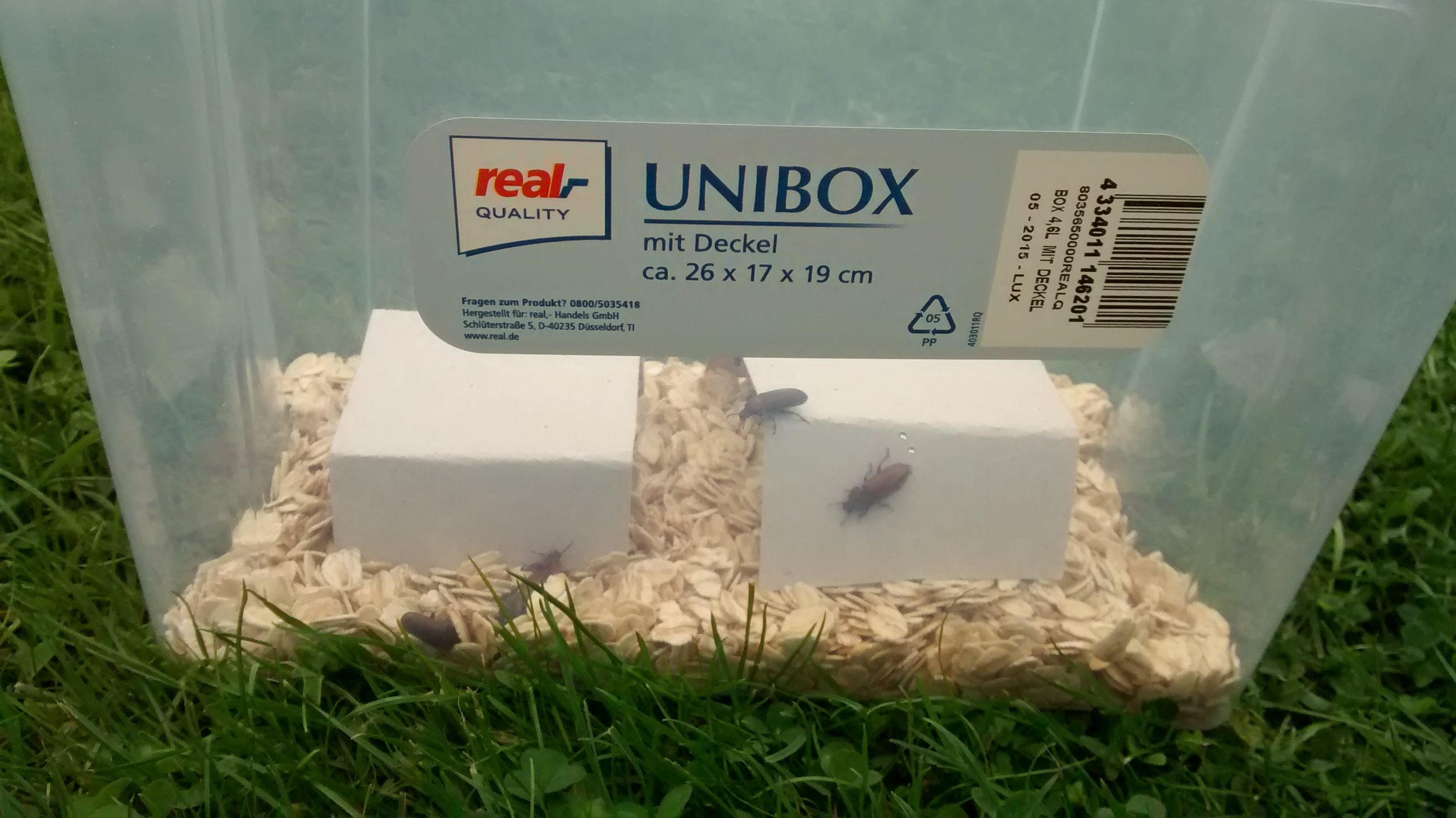 . Ich habe den Behälter dann nochmal mit einigen Käfern besetzt, wie auf den Fotos zu sehen, so dass noch mehr Eier gelegt werden und ich bald das Substrat in einen der großen Behälter geben kann, um dann dort wiederum die